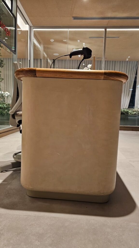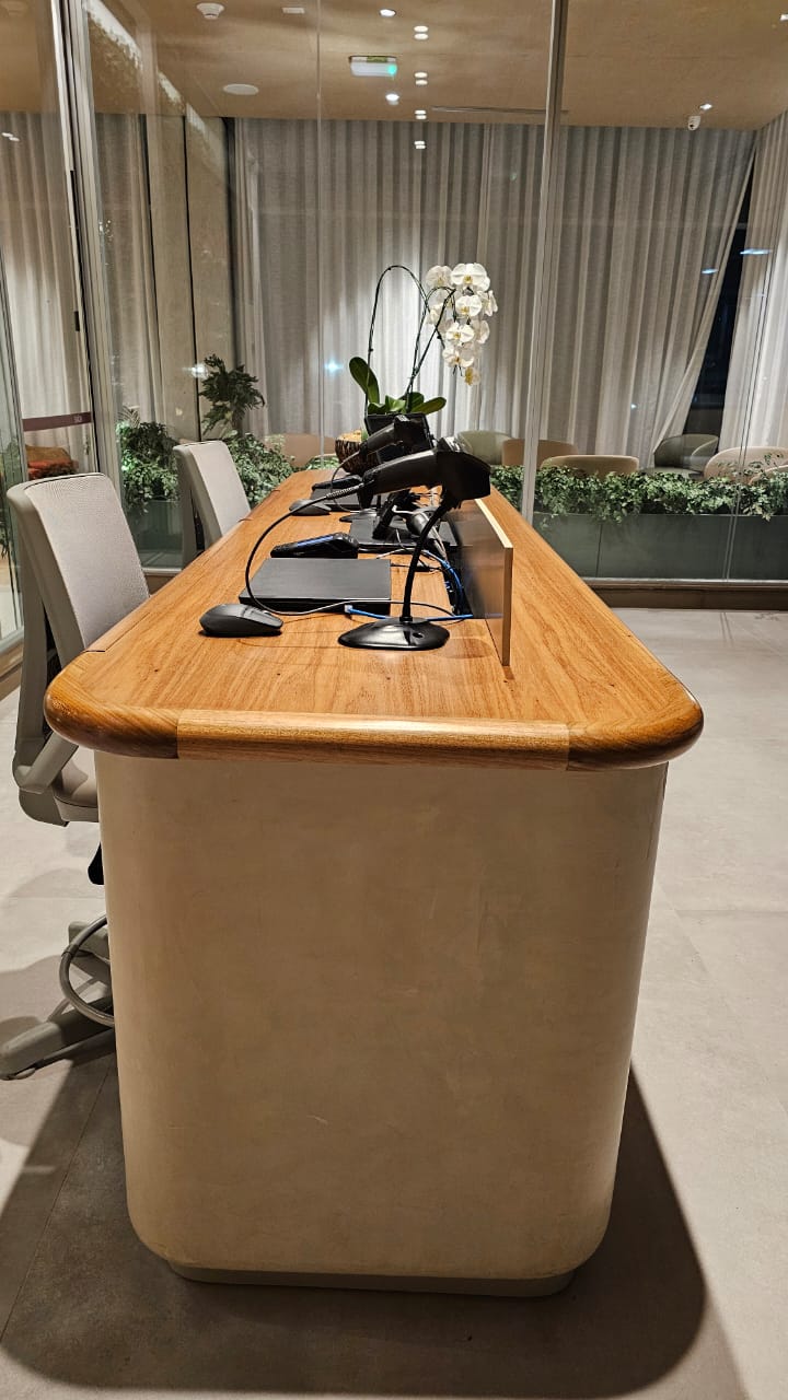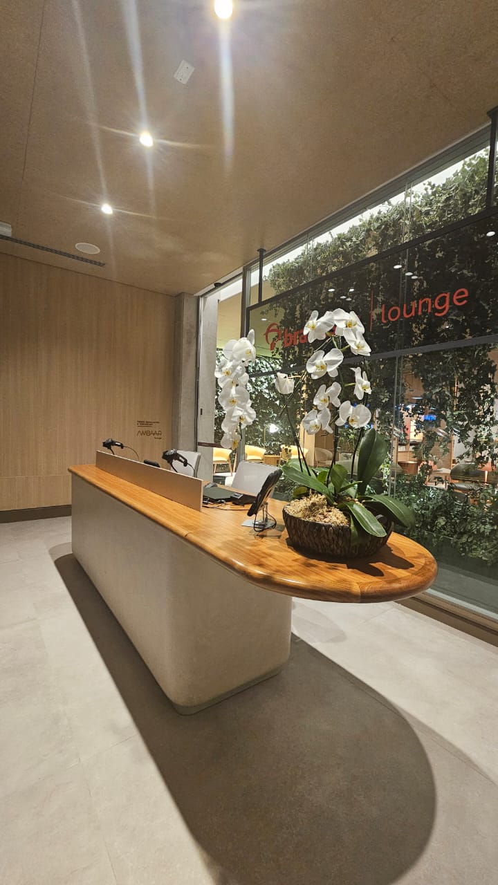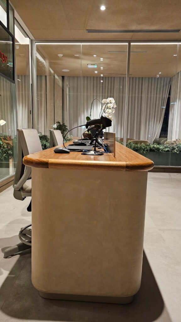 O balcão da recepção em freijó natural expressa elegância e precisão em cada curva. A base em acabamento stucco, com bordas suavemente arredondadas, confere solidez e leveza ao mesmo tempo. Gavetas embutidas e puxadores mimetizados mantêm a pureza do design, reforçando o cuidado artesanal e a integração entre estética e funcionalidade.