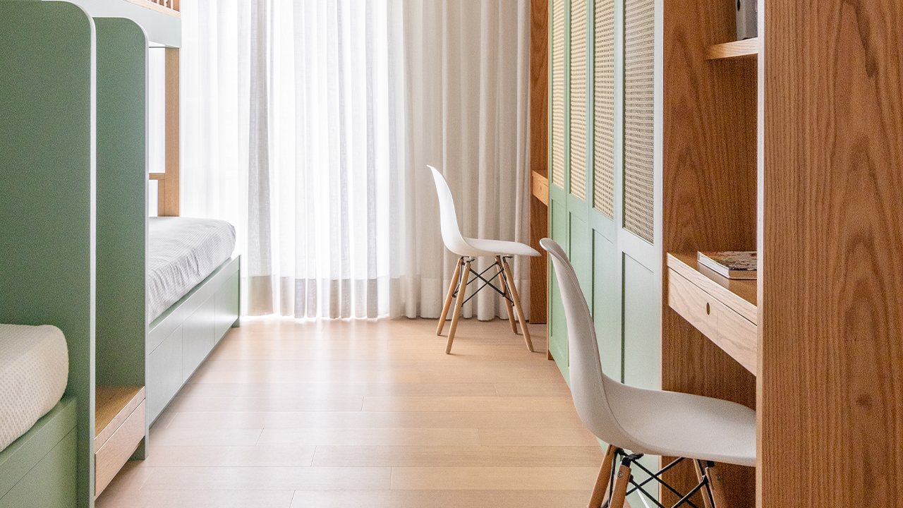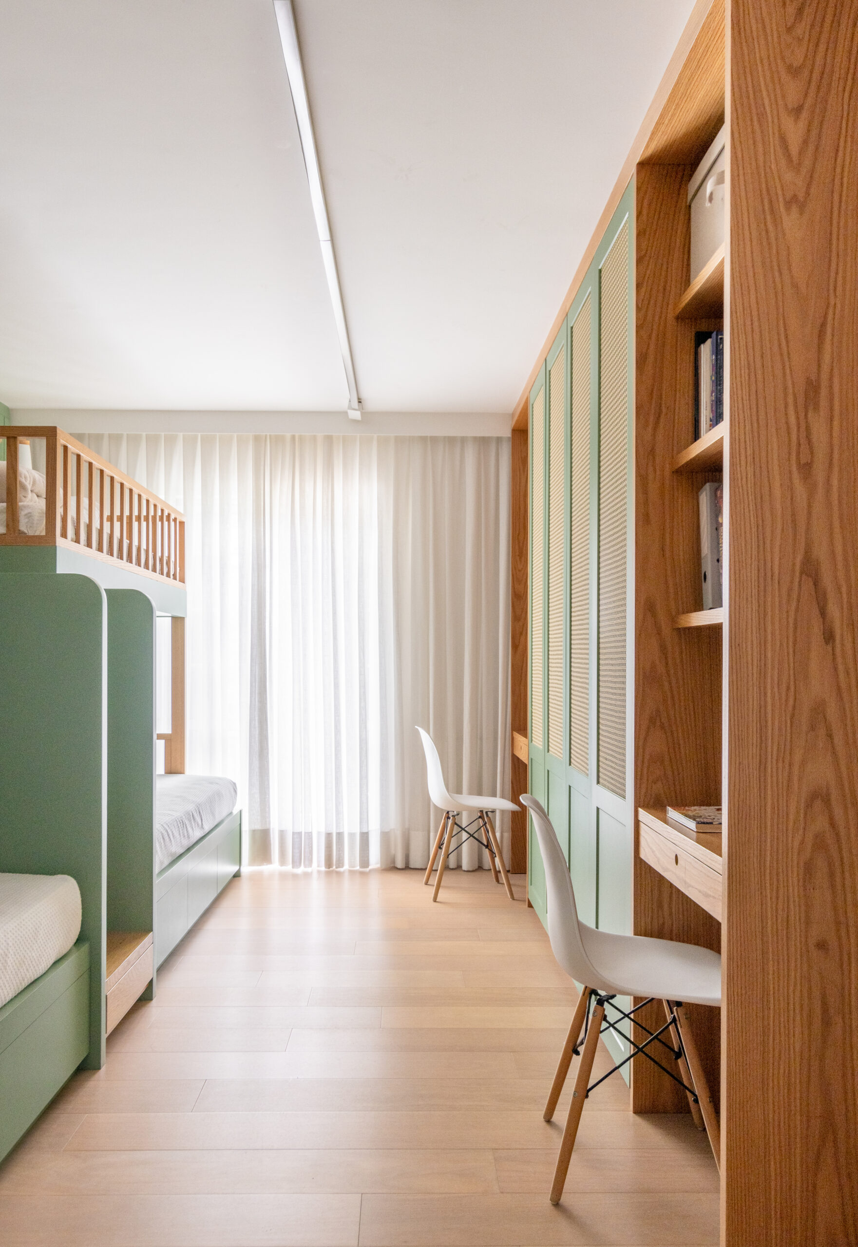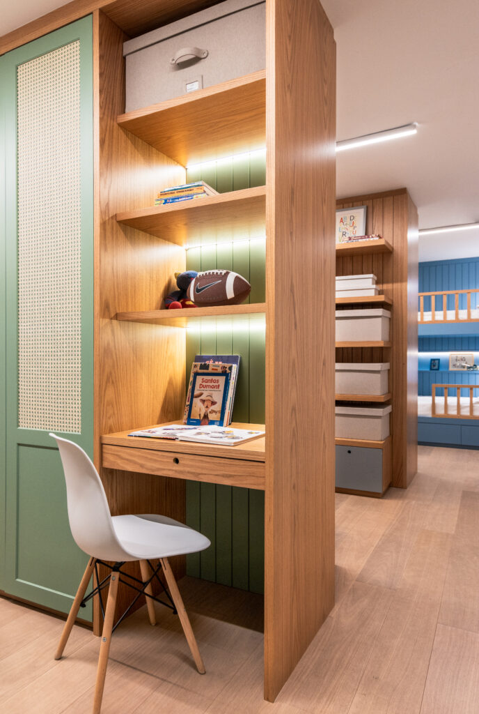 O layout foi pensado para oferecer praticidade no dia a dia, com área de estudos integrada, nichos e prateleiras iluminadas que organizam livros e objetos de forma funcional e decorativa. O mobiliário sob medida cria harmonia visual e reforça a proposta de um design atemporal, que se adapta com sutileza às diferentes fases da vida dos jovens moradores.