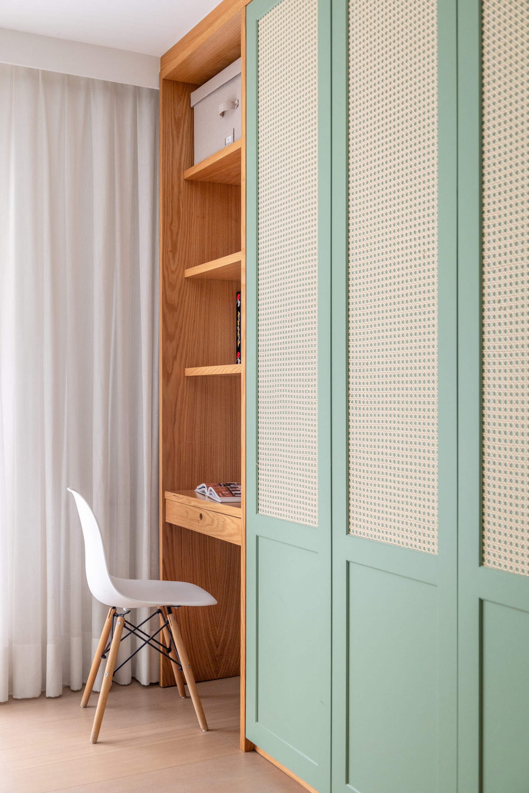 O projeto combina portas em laca verde acetinada (brilho 10%, Sayerlack) com o requinte da palha de algodão com fibra de vidro da Torcetex, resultando em um acabamento elegante e ao mesmo tempo acolhedor. A marcenaria é marcada pelo uso da lâmina de madeira natural de Carvalho Americano, que traz calor e naturalidade ao espaço.