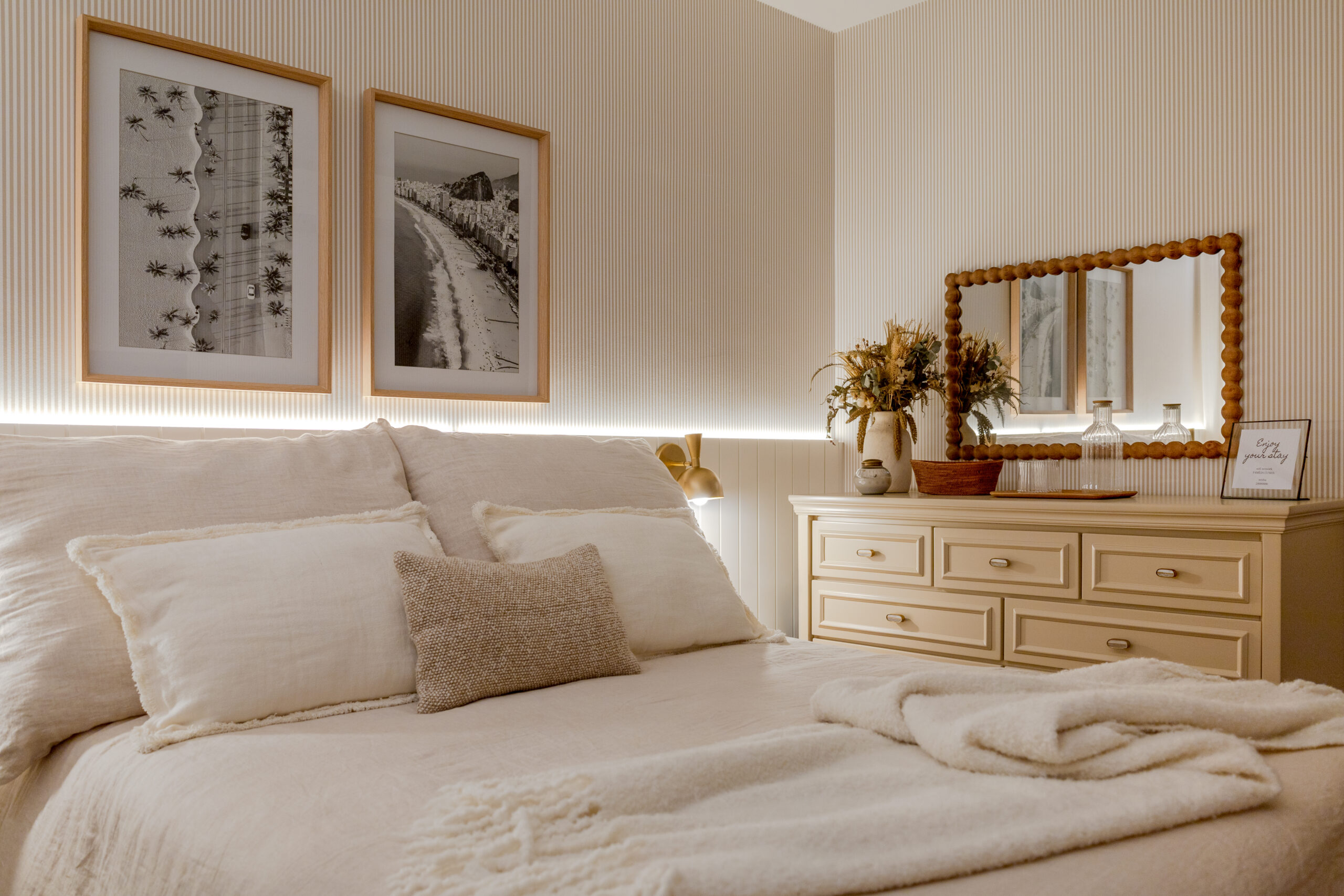 O painel sarrafeado com acabamento em laca branca acetinada (brilho 10%) e iluminação back light cria uma atmosfera intimista e sofisticada para a cabeceira da cama. Em harmonia, a cômoda em tom palha, recebe molduras no tampo e gavetas com delicados contornos boiserie, trazendo equilíbrio entre tradição e leveza contemporânea. Cada detalhe ressalta a exclusividade do mobiliário sob medida.