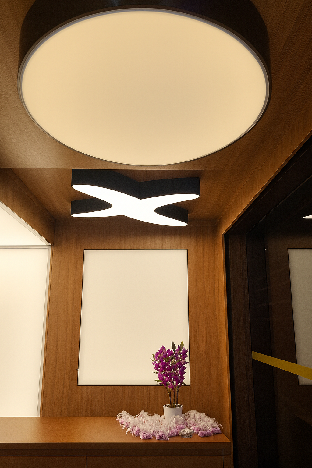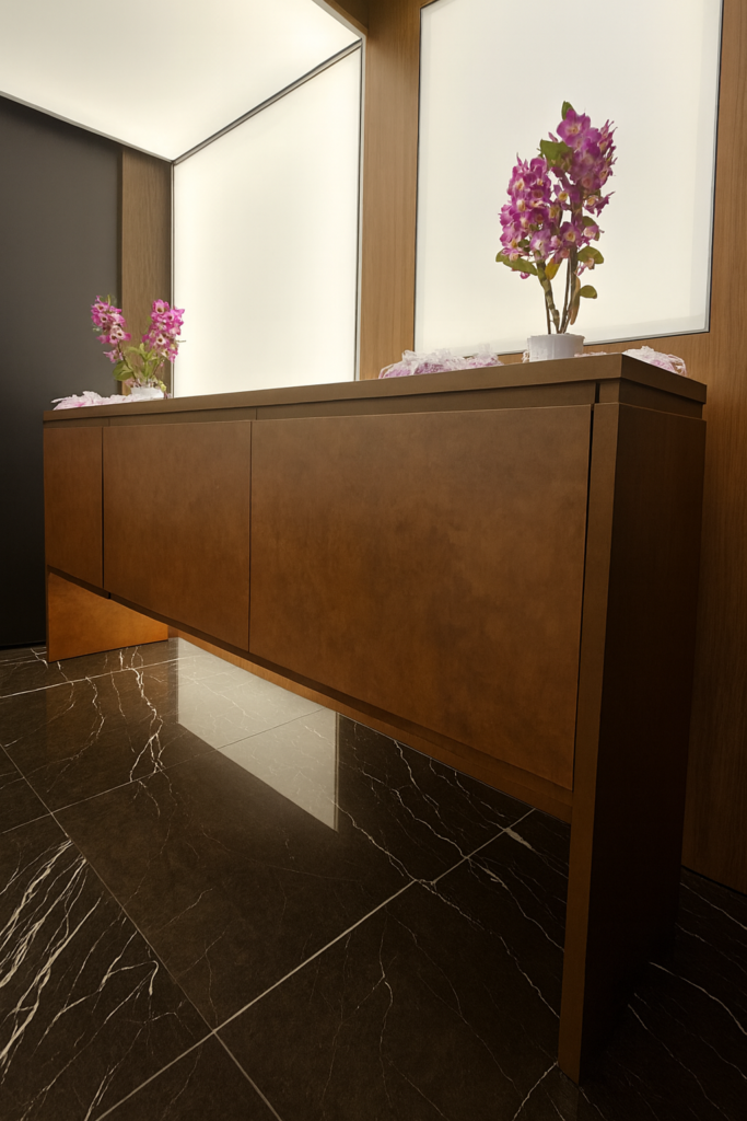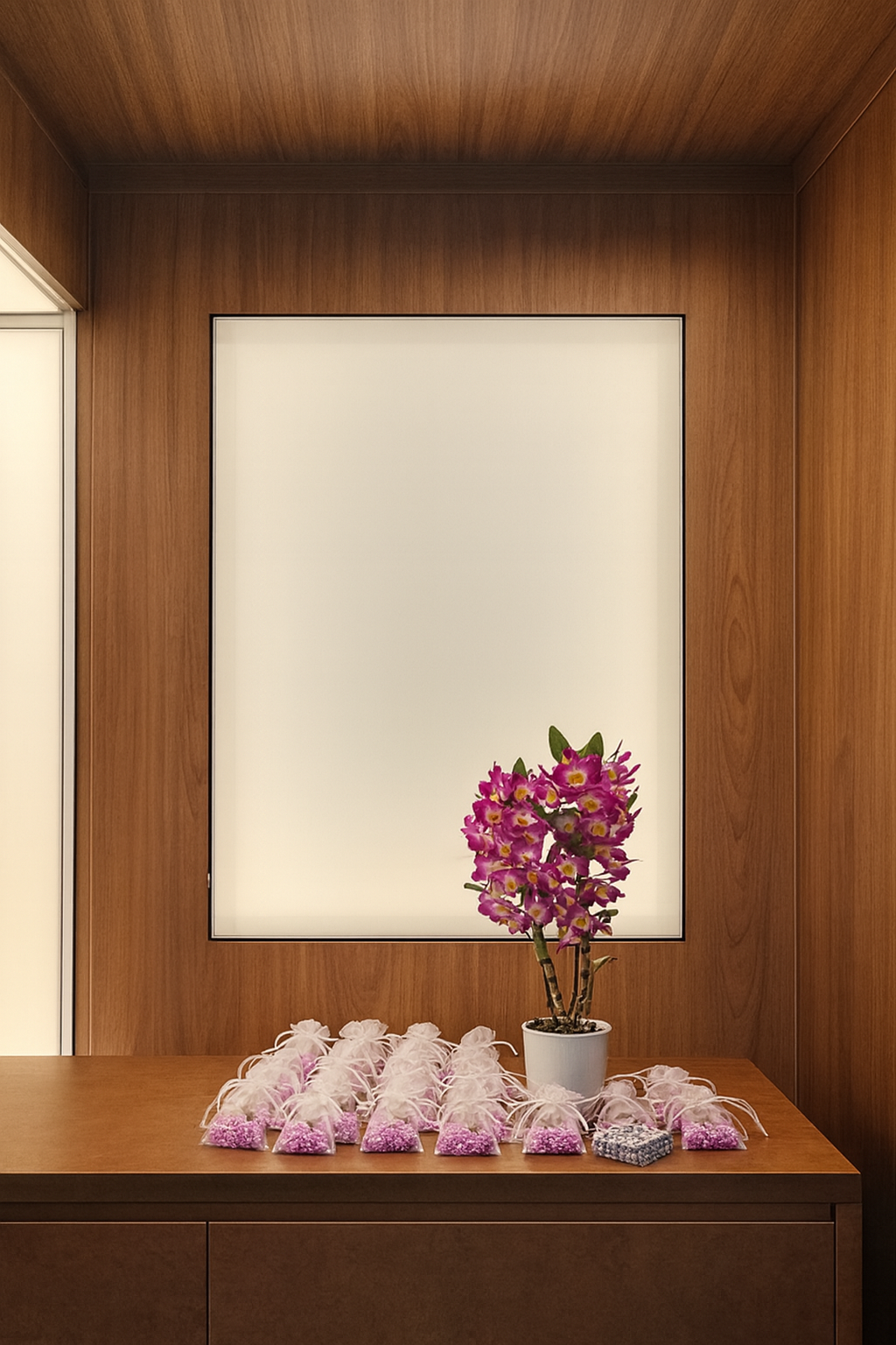 O ambiente é marcado por uma linda tela tensionada, pintada à mão pela arquiteta e artista Vania Cava, cuja composição floral — inspirada em campos de lavanda — evoca natureza, aromas e texturas. Essa obra sutil se integra à luminária de pétalas projetada pela Arq. Leticia. Sobre essa base poética, emergem as luminárias de teto e piso assinadas pelo Arquiteto Carlos Fitipaldi, peças exclusivas que exploram forma, intensidade e ritmo de luz. A execução completa da obra ficou a cargo da Made Art, que aplicou sua expertise em marcenaria de alto padrão para integrar cada detalhe com precisão. Entre os elementos especialmente desenvolvidos está também o aparador com linhas contínuas e proporções elegantes, concebido para dialogar com o ambiente e reforçar a identidade visual do projeto.