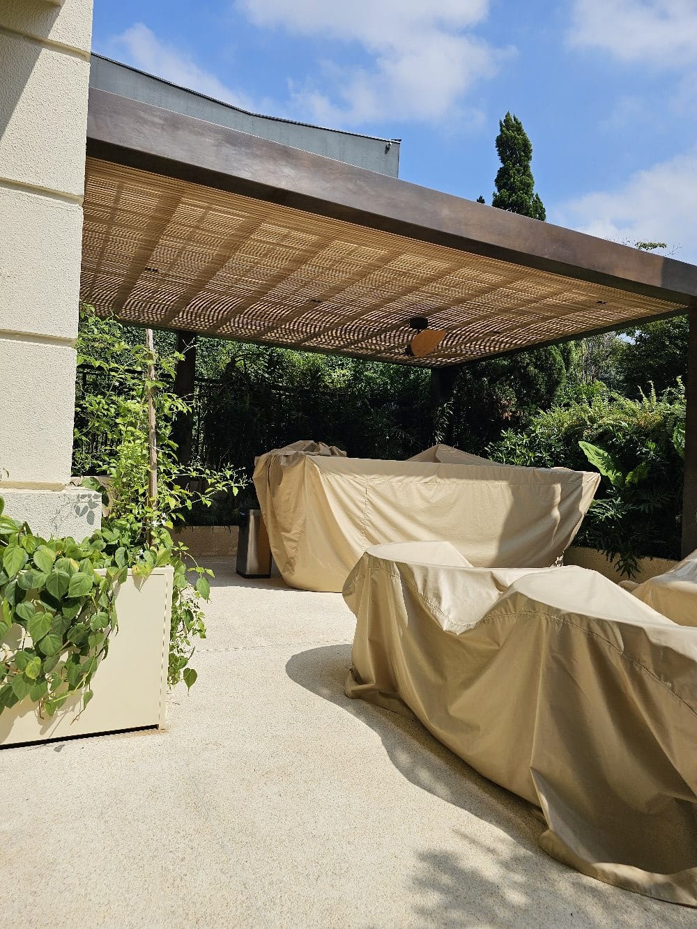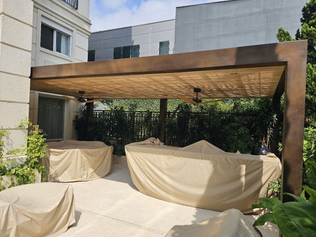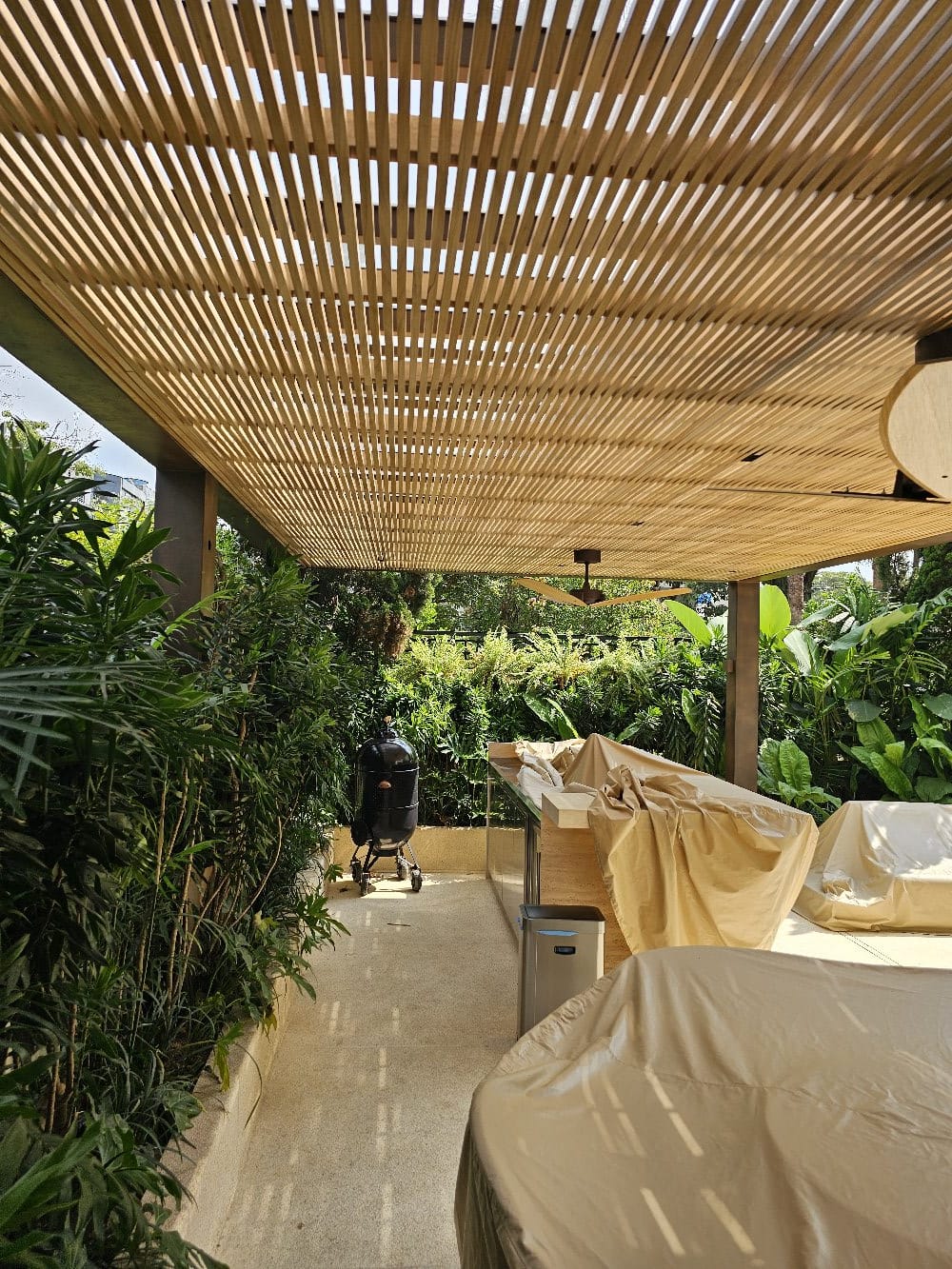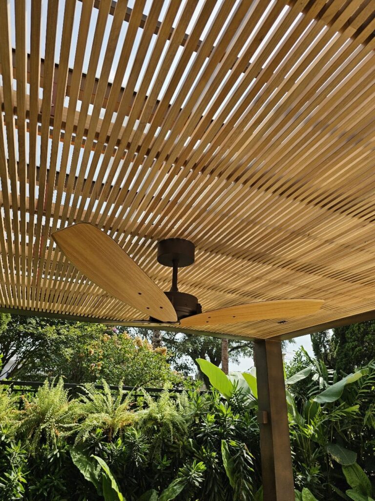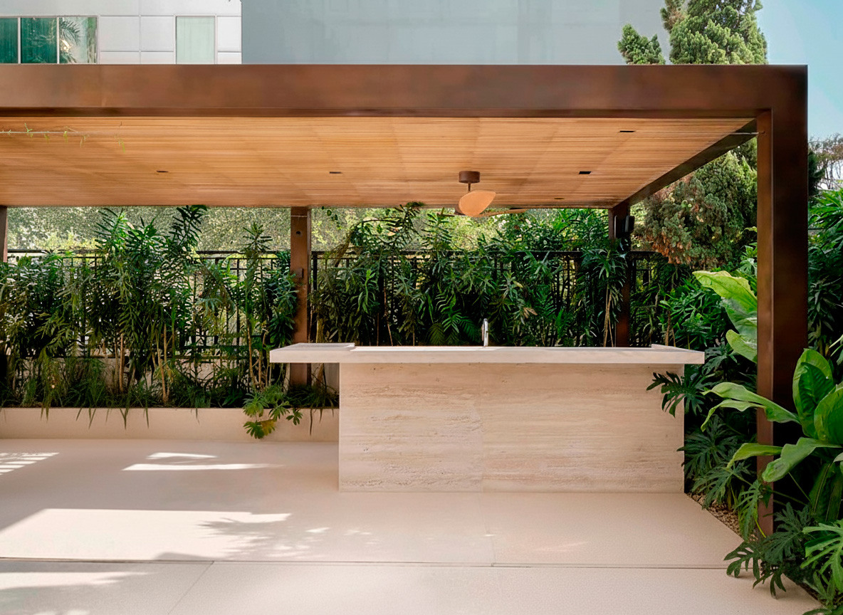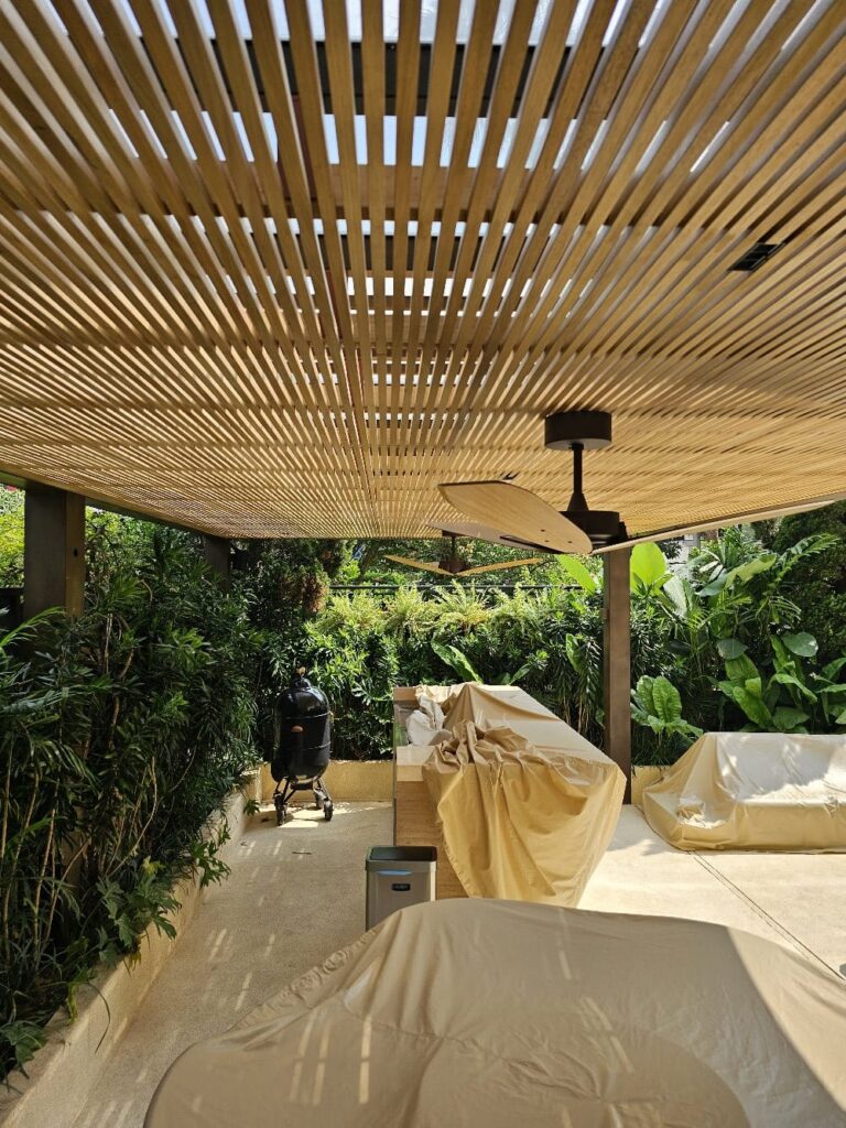 Este projeto valoriza a sofisticação do forro ripado em madeira natural de Freijó, composto por réguas de 2×2 cm com espaçamento de 1 cm. A estrutura em aço garante solidez, enquanto o ripado em madeira cria um jogo de luz e sombra que se integra com o paisagismo exuberante ao redor. Um detalhe arquitetônico que transforma o espaço externo em um refúgio elegante, acolhedor e conectado à natureza.