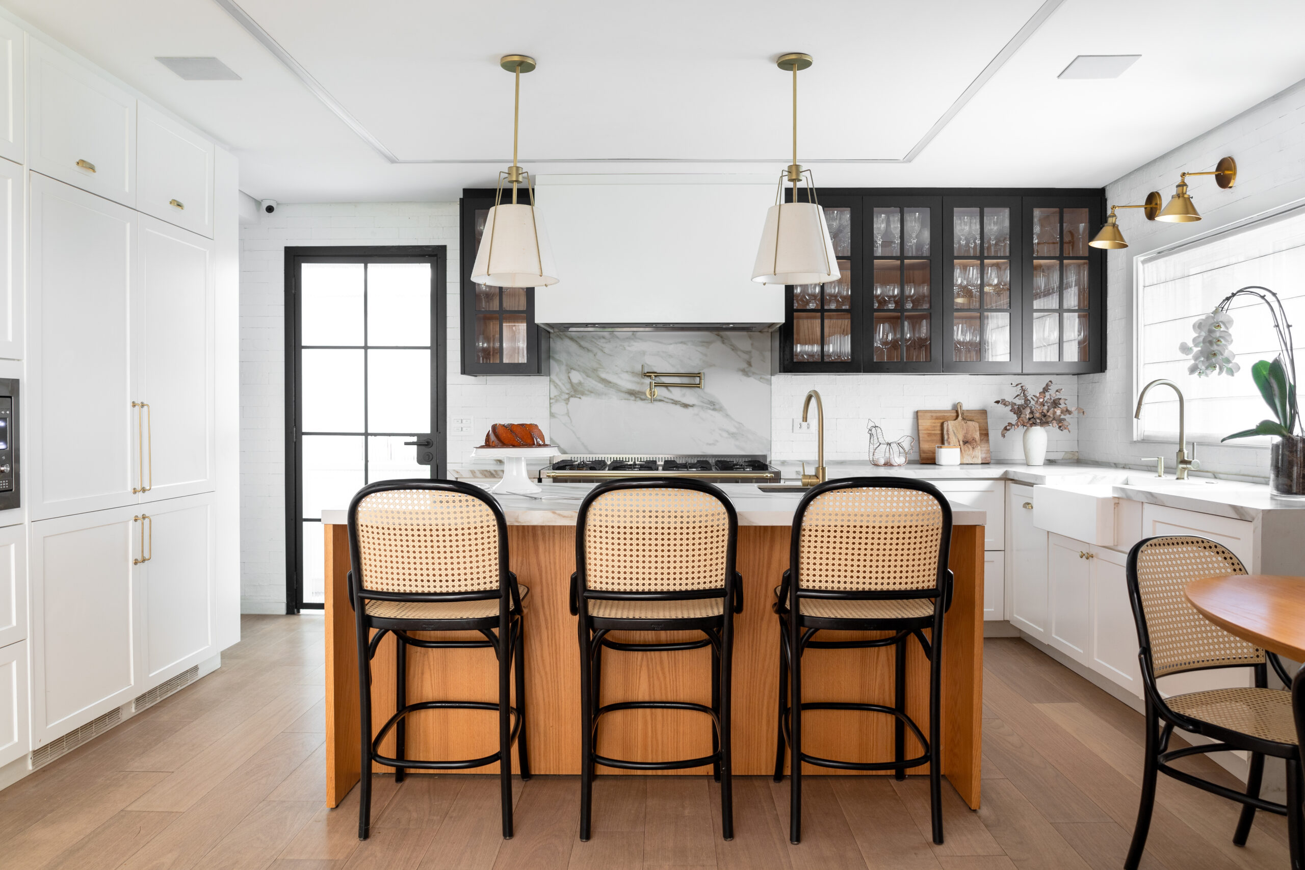 A ilha é revestida em lâmina natural de carvalho americano, com puxadores em latão no estilo concha e estrutura interna em MDF Branco Ultra, garantindo resistência à umidade e durabilidade. O design valoriza a naturalidade da madeira, contrastando com o mármore branco dos tampos e compondo com os armários laqueados brancos e os aéreos em preto, iluminados com sofisticação. O resultado é uma cozinha equilibrada, elegante e atemporal, onde cada detalhe reforça a integração arquitetônica do espaço.