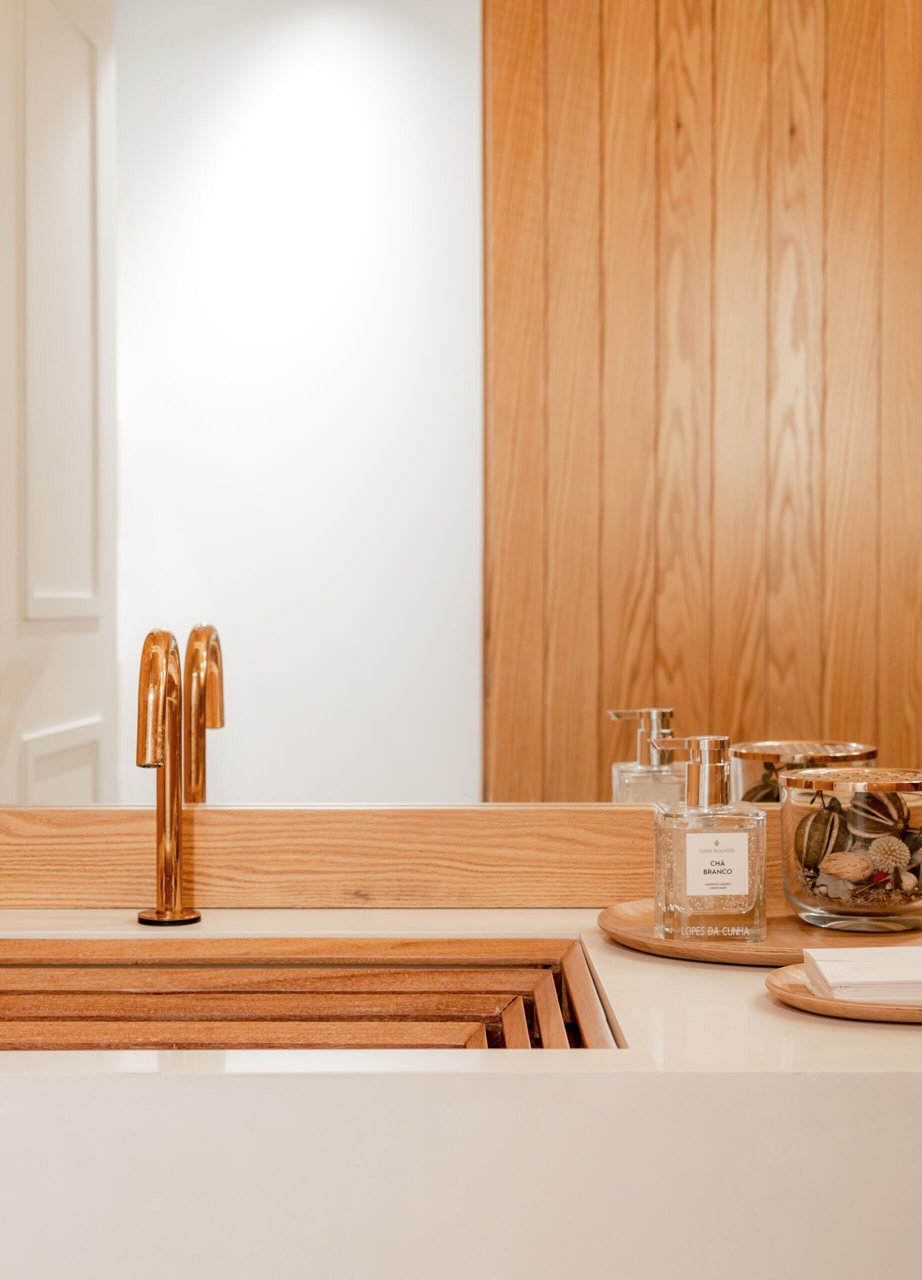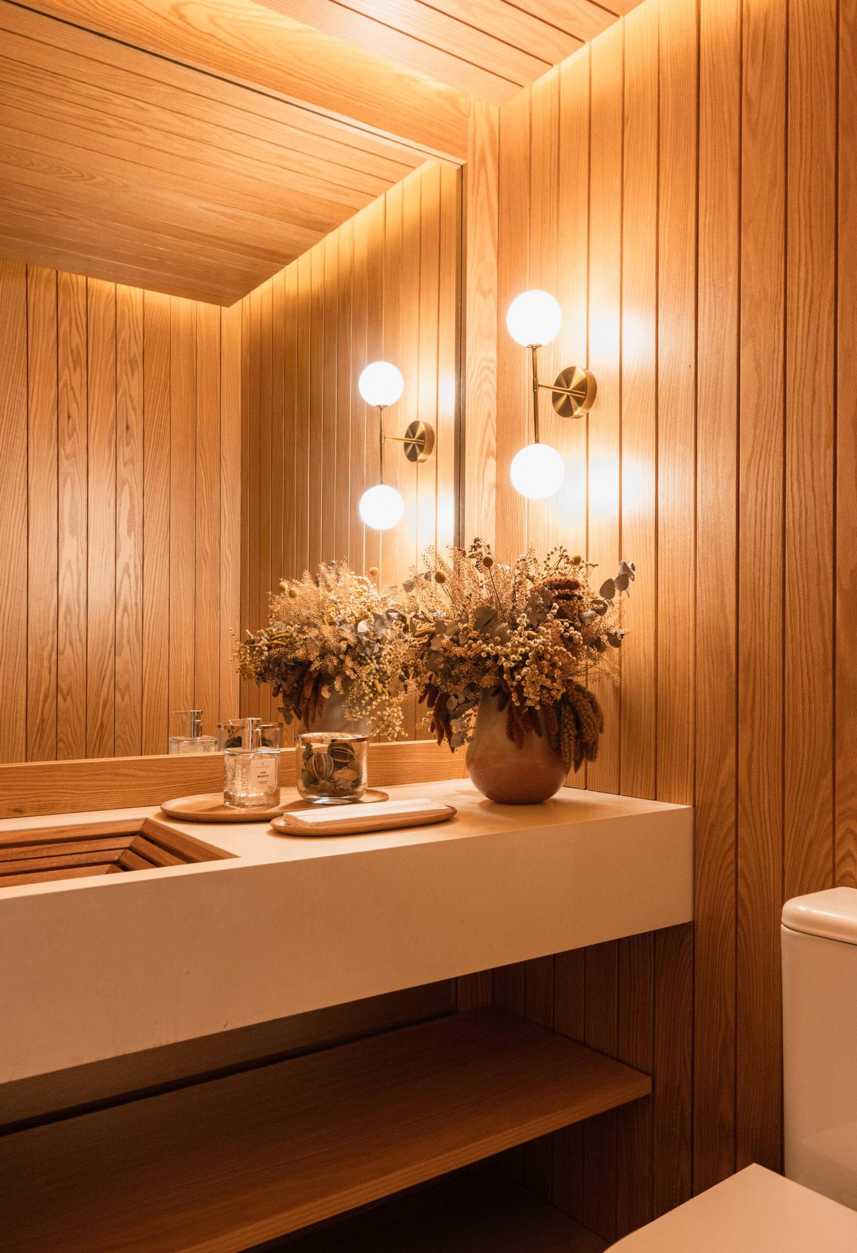 Envolto pela elegância atemporal do carvalho americano, este lavabo revela a precisão artesanal em cada detalhe. A cuba em madeira Cumaru, de desenho exclusivo, dialoga com o painel vertical que reveste as paredes, criando um espaço de sofisticação serena. A iluminação realça a textura nobre da madeira, transformando a funcionalidade em experiência estética. Um ambiente projetado para traduzir a essência da marcenaria de luxo: integração perfeita entre design, materiais naturais e exclusividade.