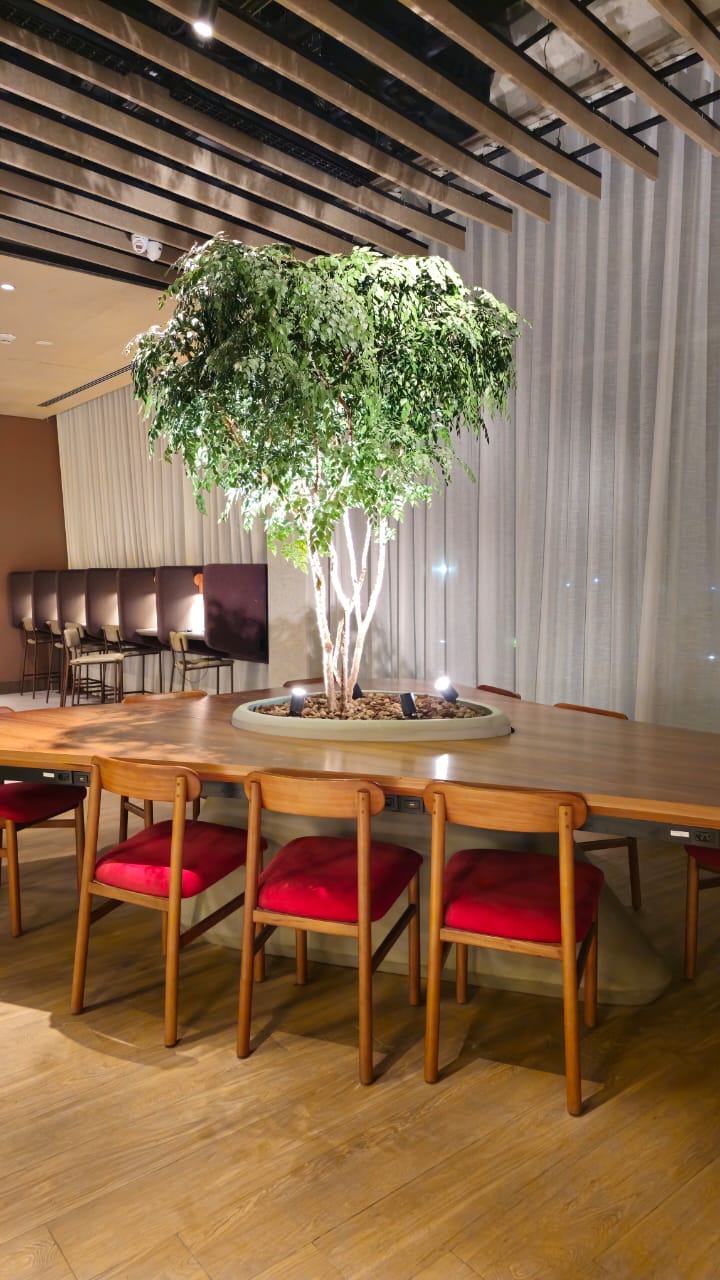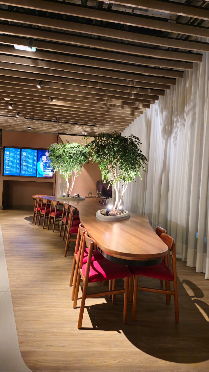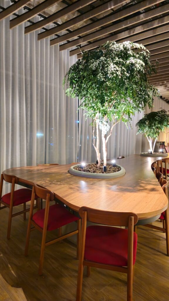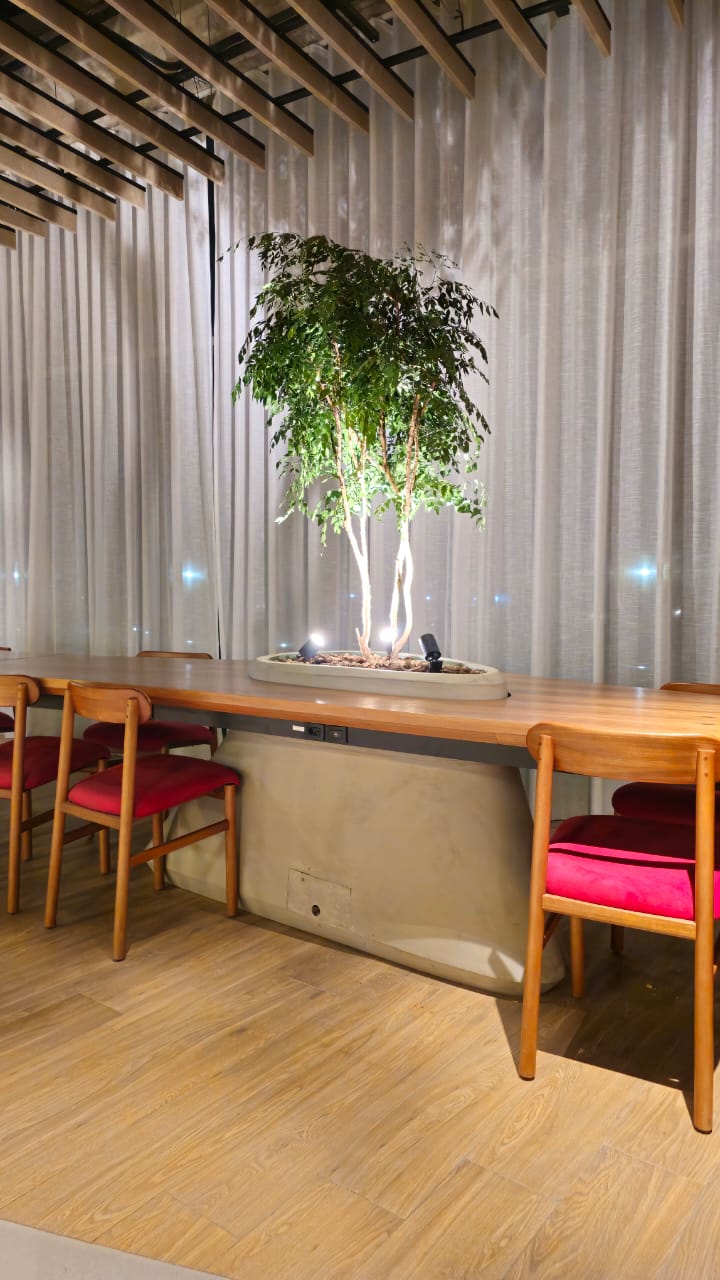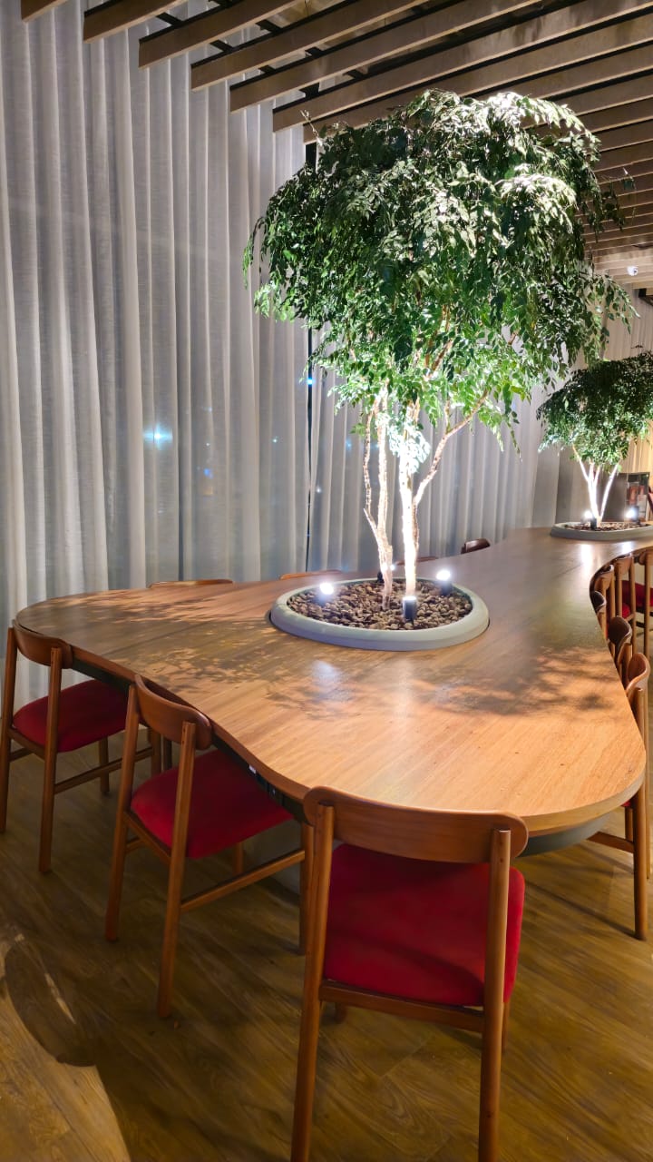 A mesa orgânica em freijó natural traduz a fusão entre arquitetura, marcenaria e paisagismo. Suas formas fluidas envolvem as árvores integradas à estrutura, criando uma conexão viva entre materialidade e natureza. A base com padrão de concreto aparente revela força e equilíbrio, enquanto a engenharia sob medida garante precisão e leveza. Um projeto de luxo que transforma o espaço corporativo em uma experiência sensorial de elegância e harmonia.