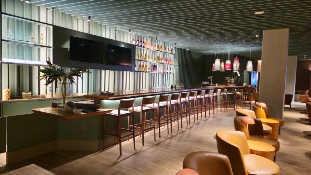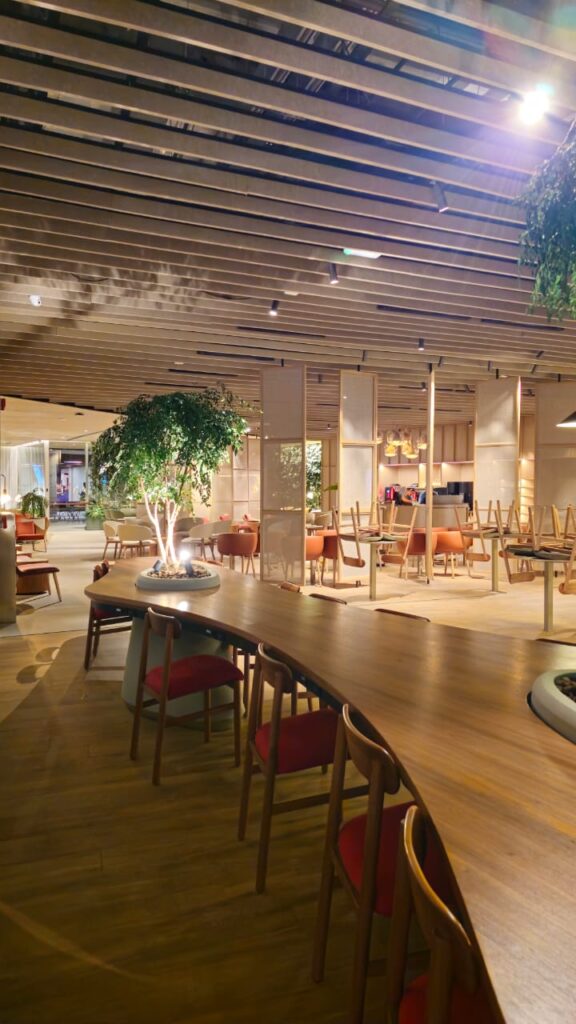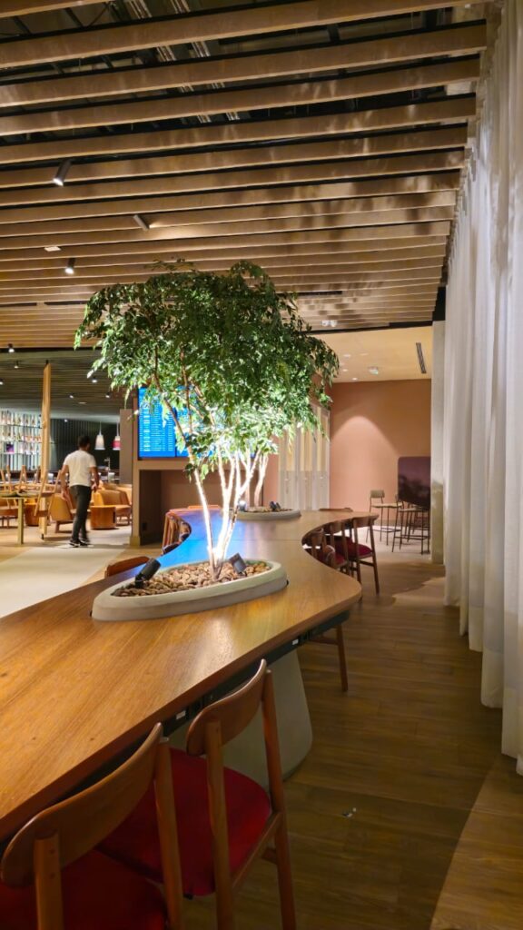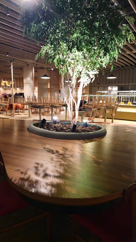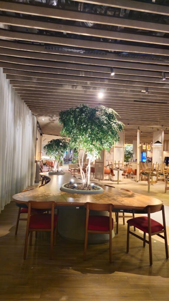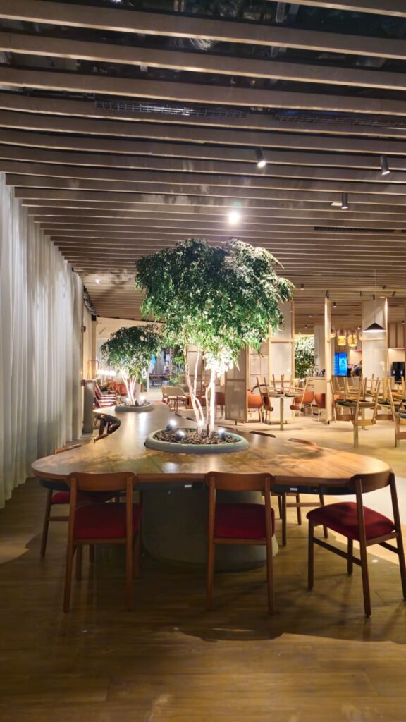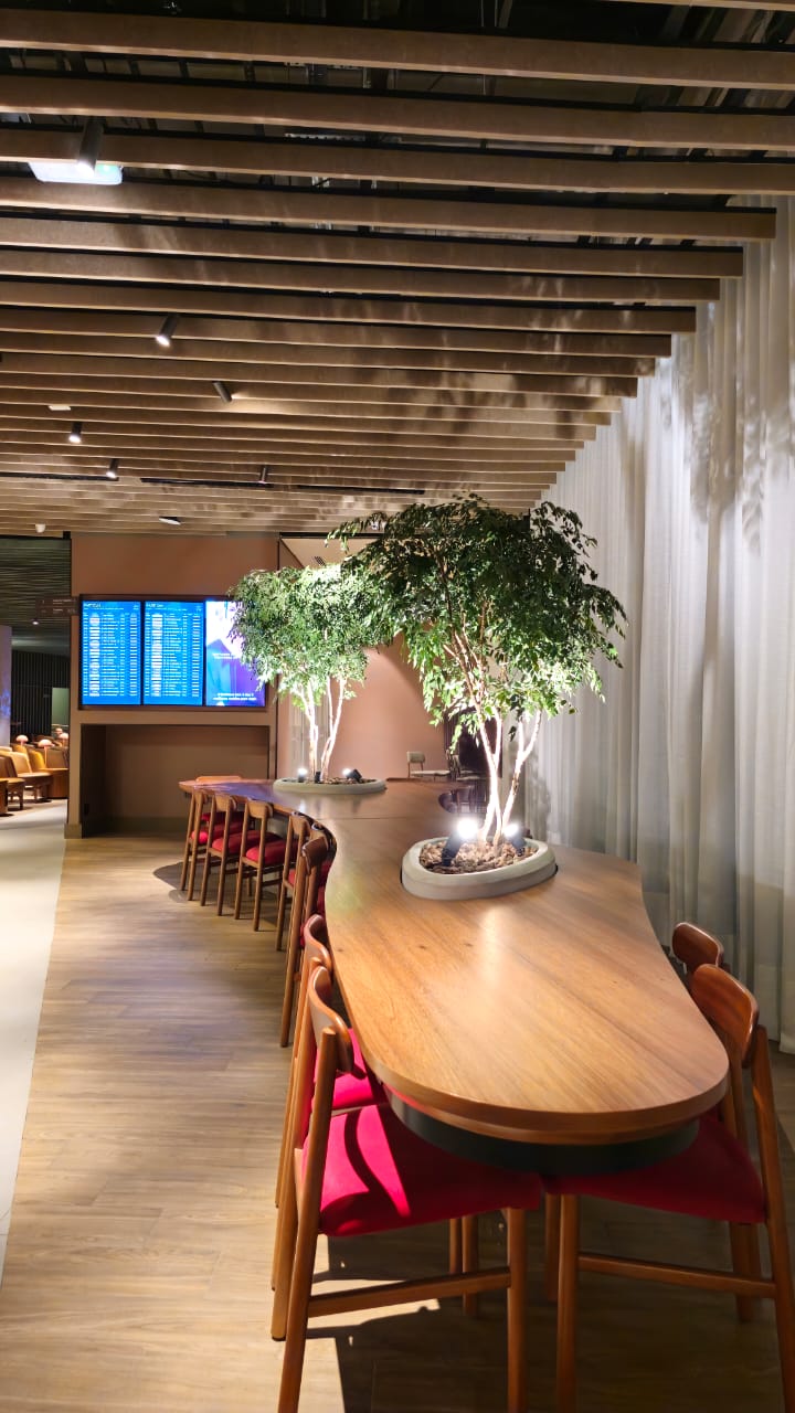 A mesa orgânica em freijó natural traduz a fusão entre arquitetura, marcenaria e paisagismo. Suas formas fluidas envolvem as árvores integradas à estrutura, criando uma conexão viva entre materialidade e natureza. A base com padrão de concreto aparente revela força e equilíbrio, enquanto a engenharia sob medida garante precisão e leveza. Um projeto de luxo que transforma o espaço corporativo em uma experiência sensorial de elegância e harmonia.