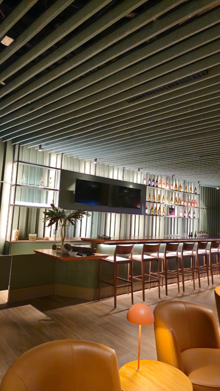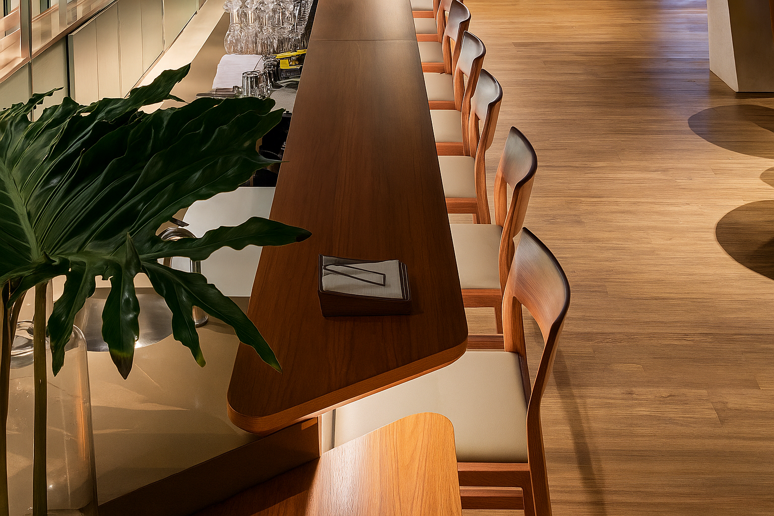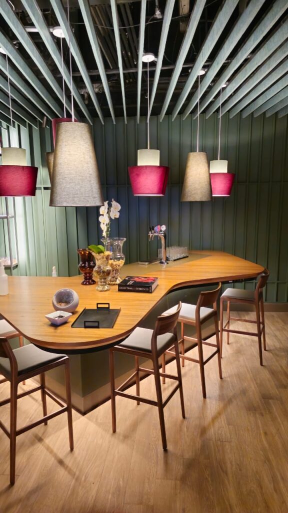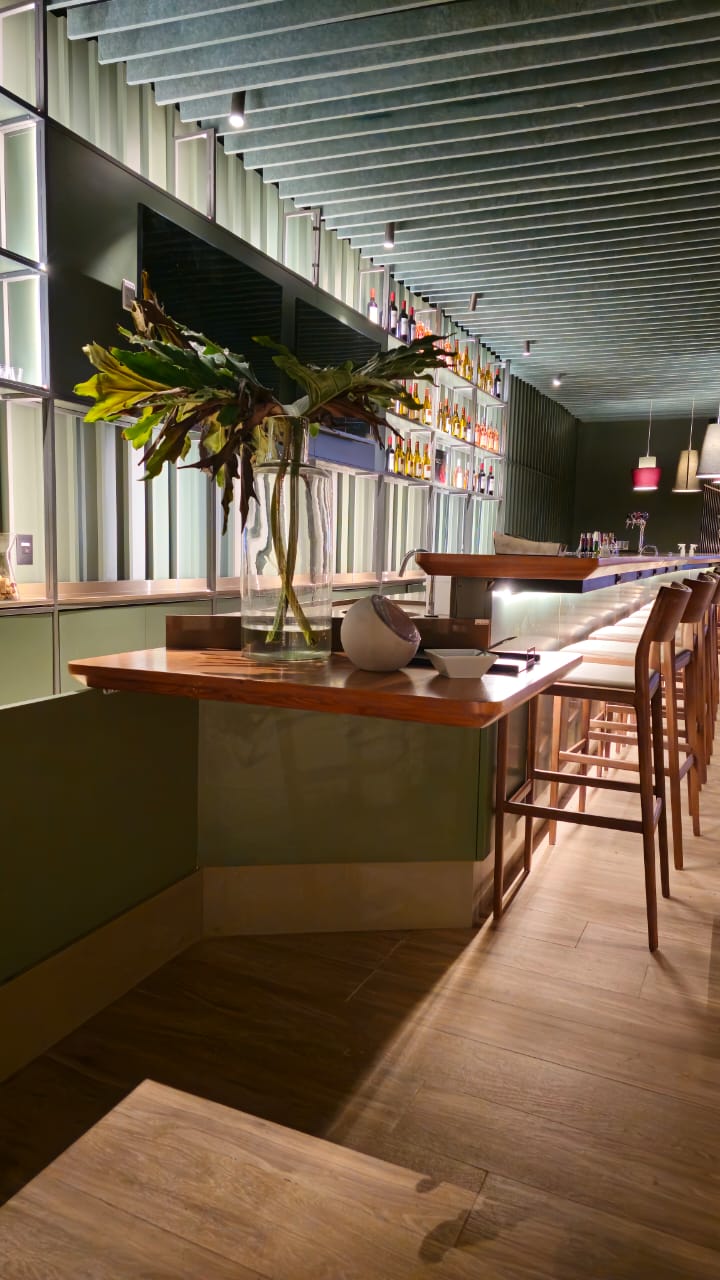 Com mais de sete metros de extensão, o balcão bar é uma obra de precisão e sofisticação. O tampo em madeira natural de freijó, com acabamento em verniz PU acetinado, exibe curvas orgânicas que se fundem a linhas retas em absoluta harmonia. Sua estrutura em MDF Verde Floresta da Duratex abriga uma completa infraestrutura funcional — adega climatizada, geladeiras, áreas de preparo e chopeira.