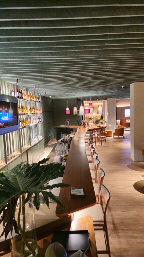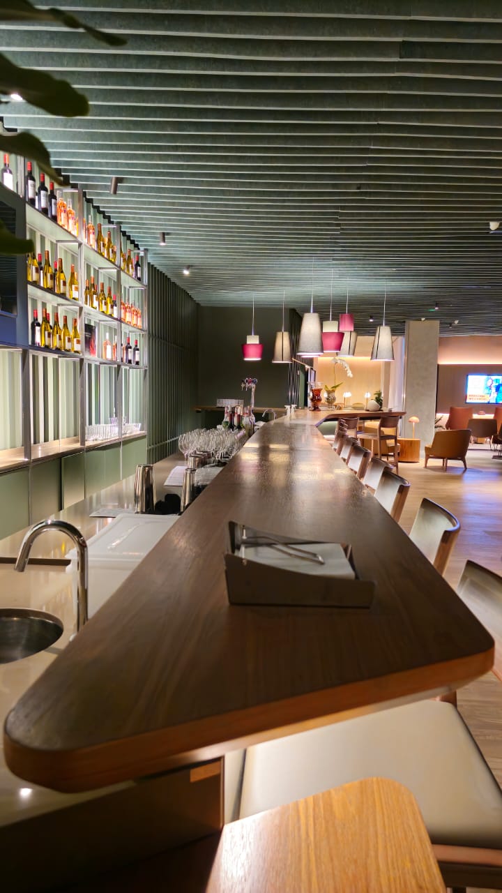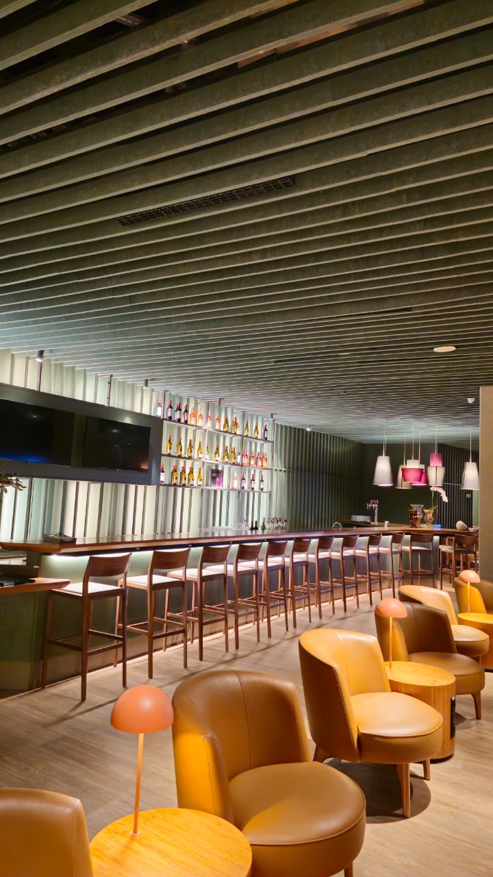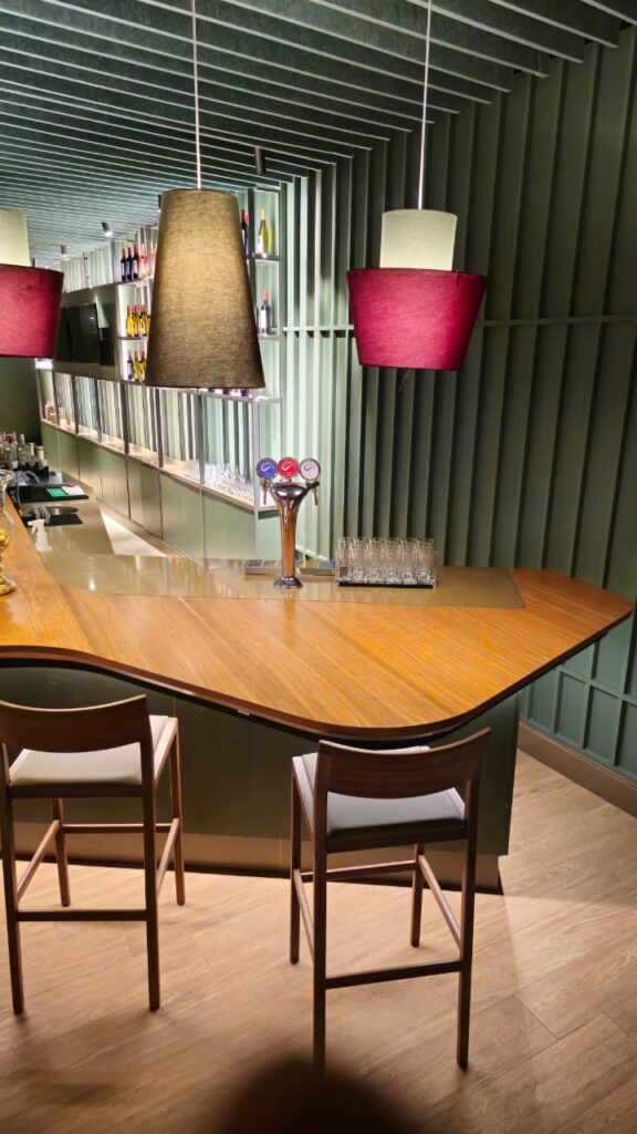 Com mais de sete metros de extensão, o balcão bar é uma obra de precisão e sofisticação. O tampo em madeira natural de freijó, com acabamento em verniz PU acetinado, exibe curvas orgânicas que se fundem a linhas retas em absoluta harmonia. Sua estrutura em MDF Verde Floresta da Duratex abriga uma completa infraestrutura funcional — adega climatizada, geladeiras, áreas de preparo e chopeira.