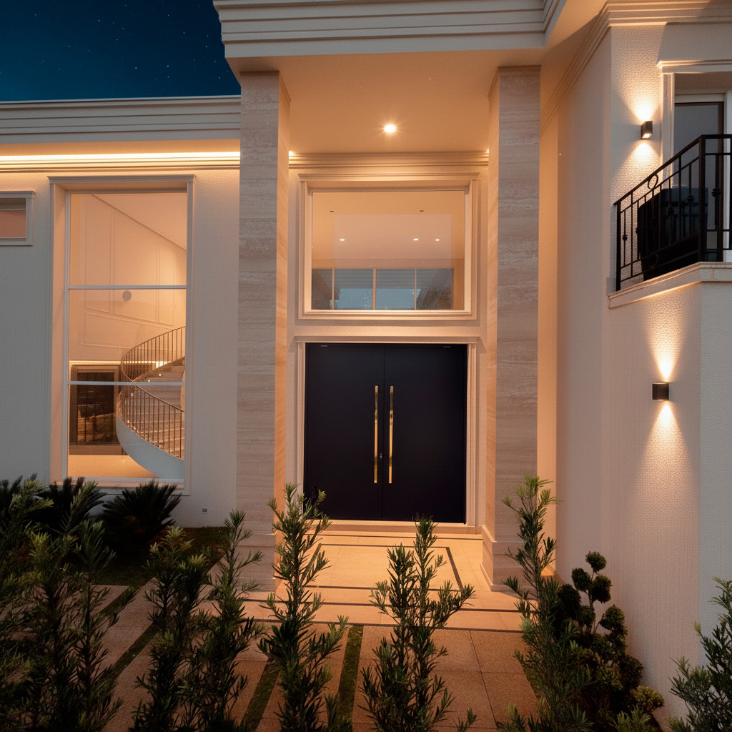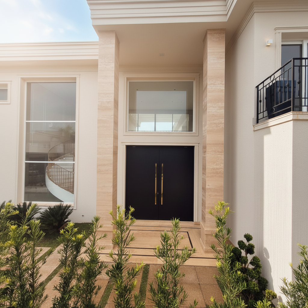 Os puxadores de 1,80m em metal nobre reforçam a verticalidade e a elegância das linhas, enquanto os batentes de 25cm de largura emolduram a entrada como um verdadeiro portal. O contraste do preto fosco com os tons claros da fachada valoriza ainda mais a arquitetura contemporânea da residência, marcada por proporções generosas e equilíbrio visual.