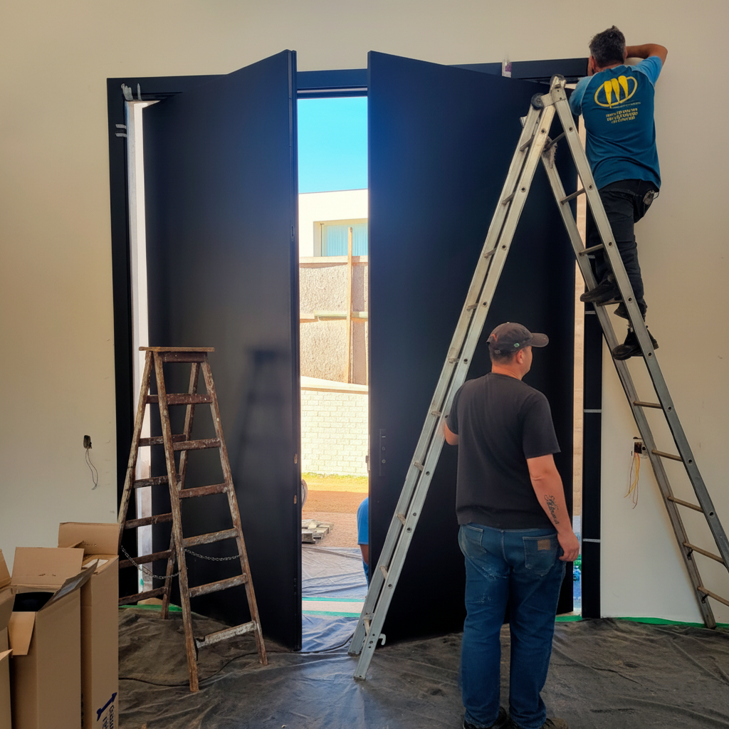 Com 3,40m de altura e 3,00m de largura em duas folhas pivotantes, esta porta sob medida é uma peça de arquitetura que combina imponência e sofisticação. A estrutura reforçada em aço, o preenchimento interno com lã de rocha para tratamento acústico e o acabamento externo em pintura náutica preto fosco, resistente às intempéries, garantem durabilidade e desempenho técnico impecáveis.