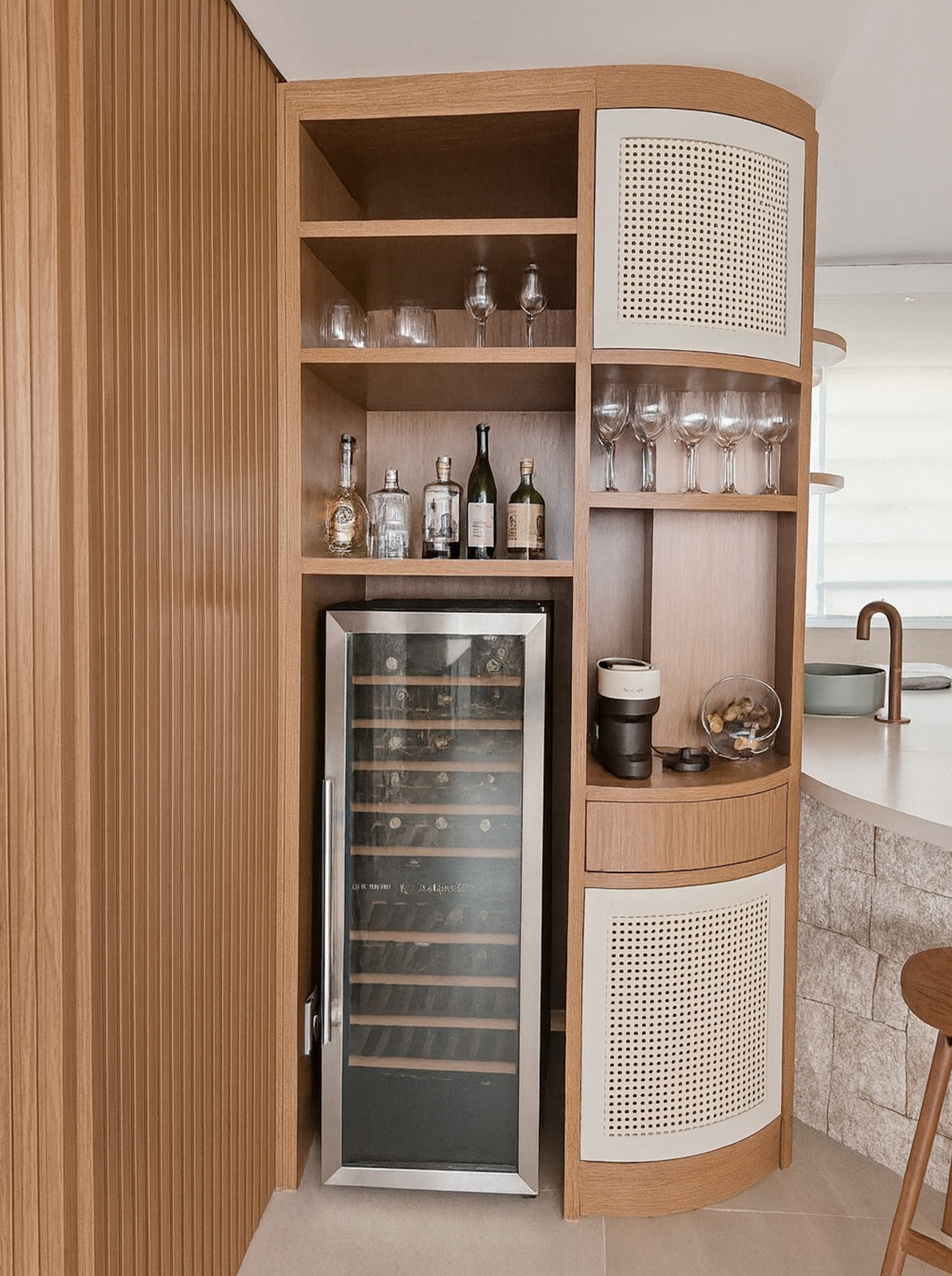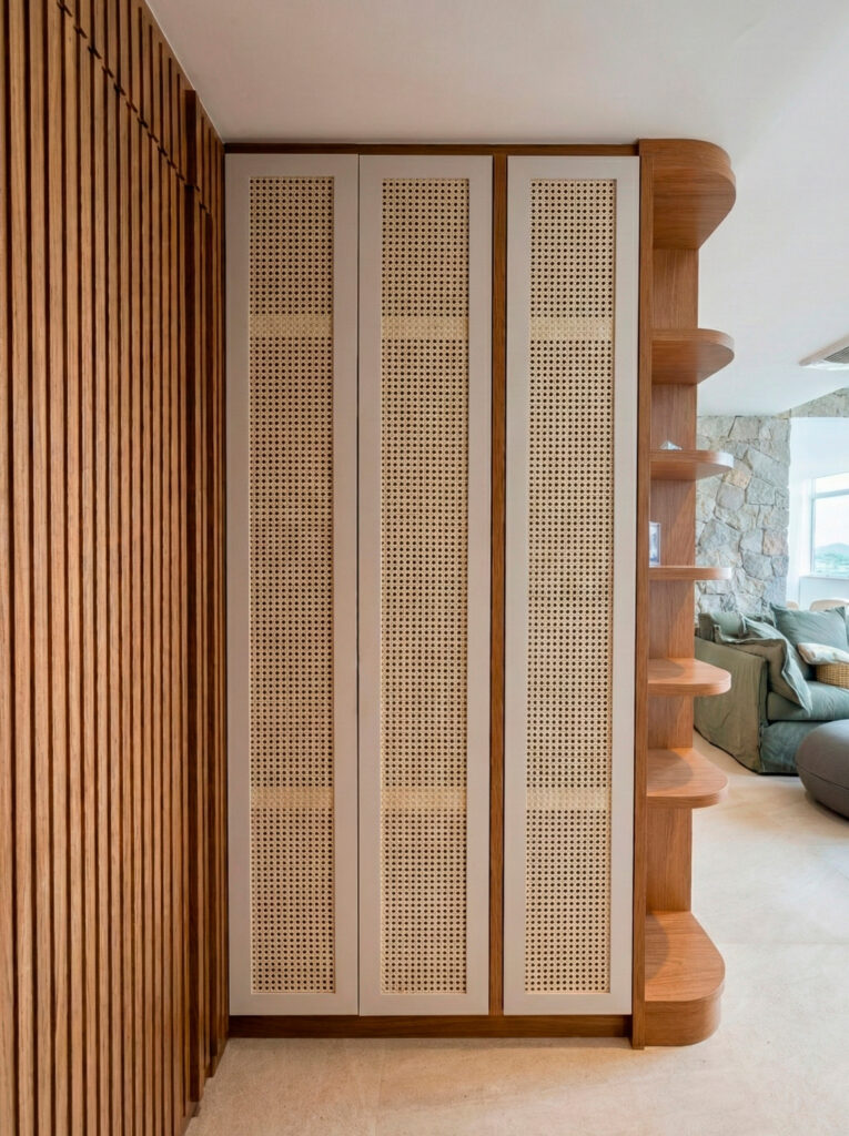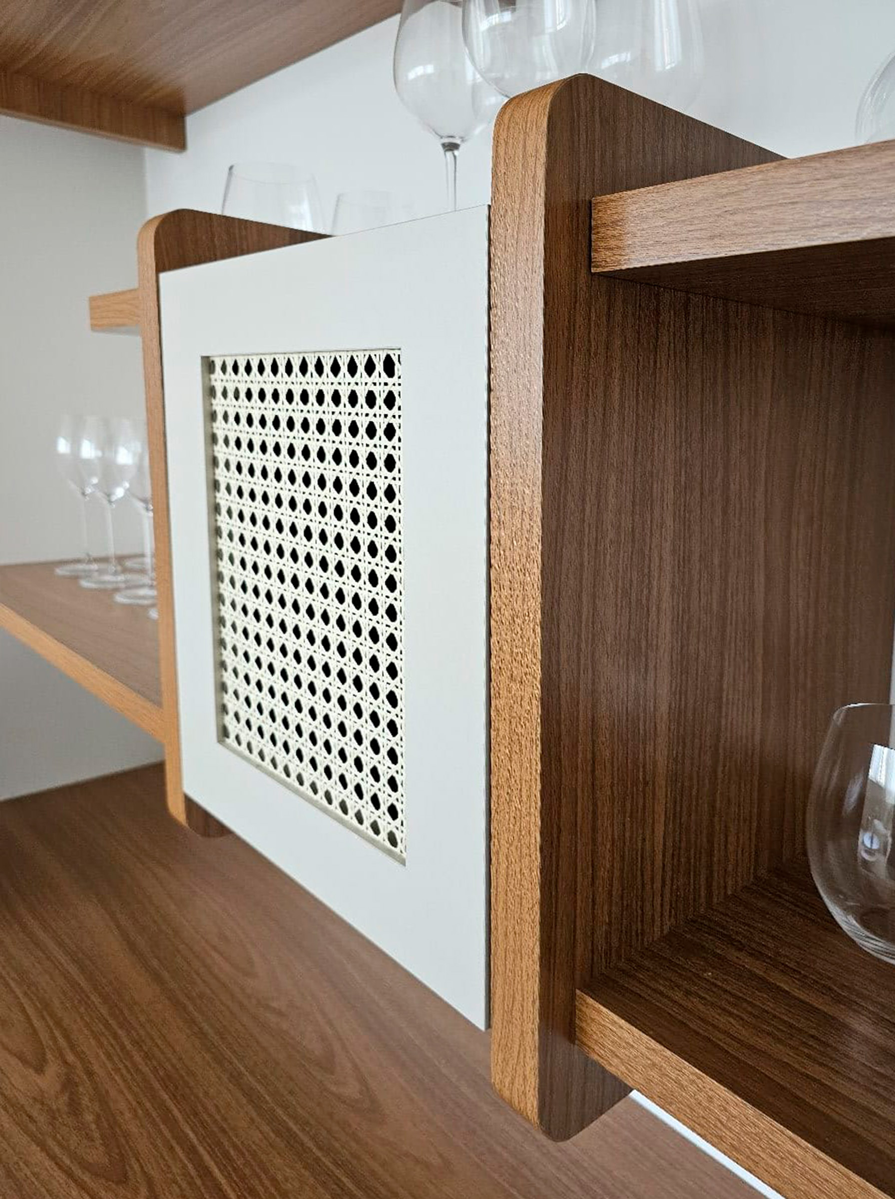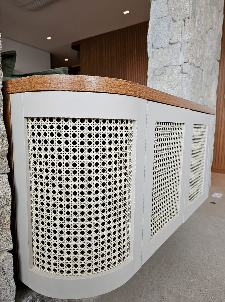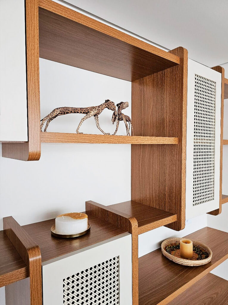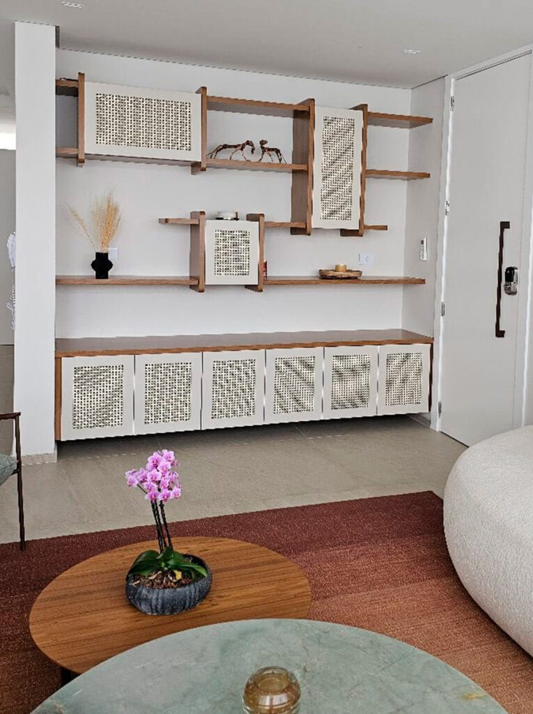 O projeto explora a combinação de MDF padrão amadeirado e superfícies laqueadas, criando uma base elegante e acolhedora, enriquecida pela presença de elementos tradicionais como a palhinha natural. Esse diálogo entre o contemporâneo e o clássico confere identidade aos ambientes, imprimindo leveza visual e uma sofisticação silenciosa. Cozinha, áreas sociais e suítes foram desenhadas com atenção rigorosa às proporções, aos detalhes de acabamento e à integração entre mobiliário e arquitetura.