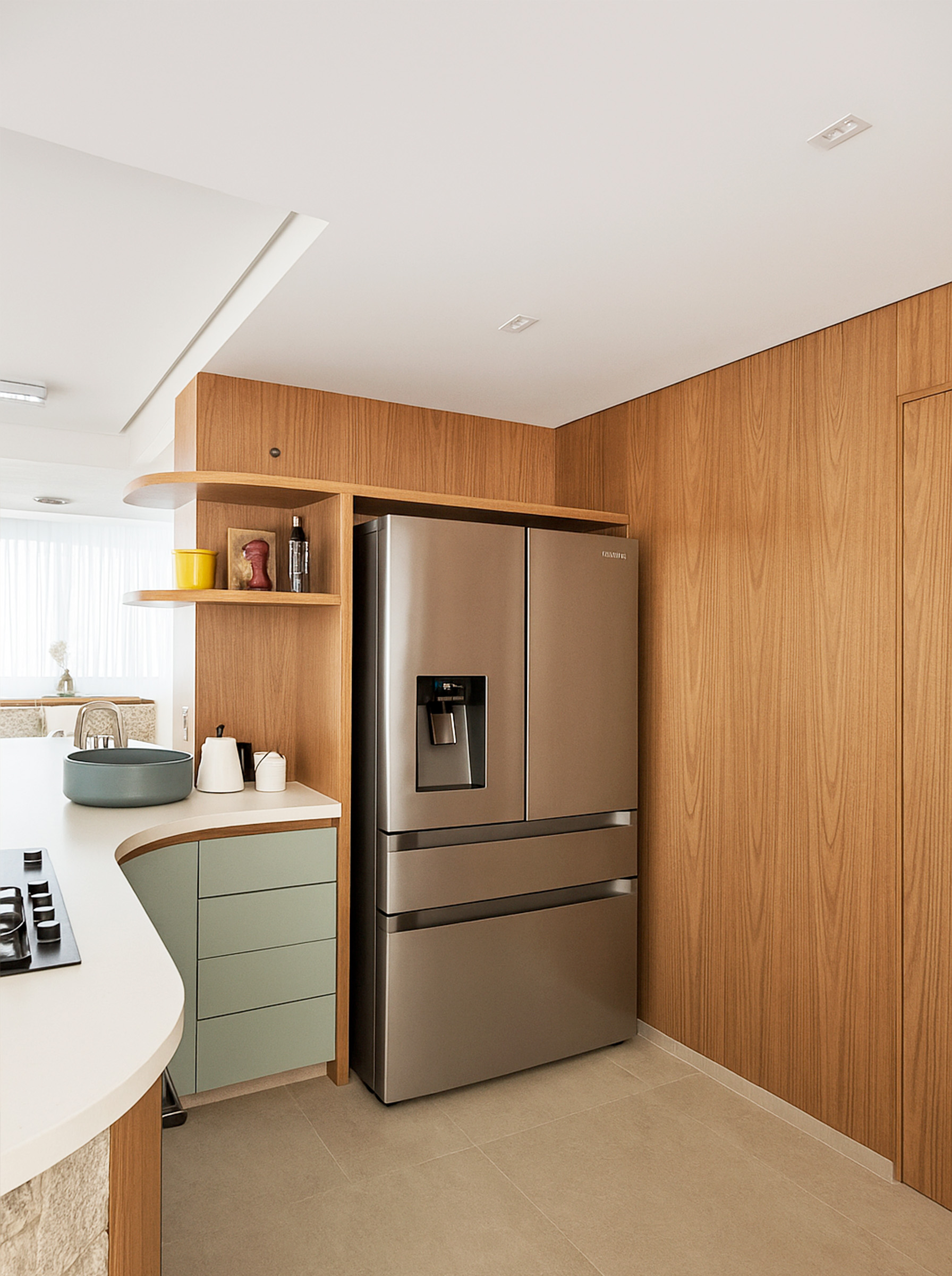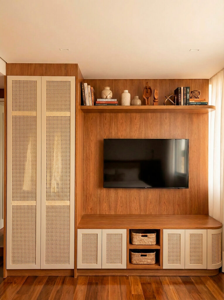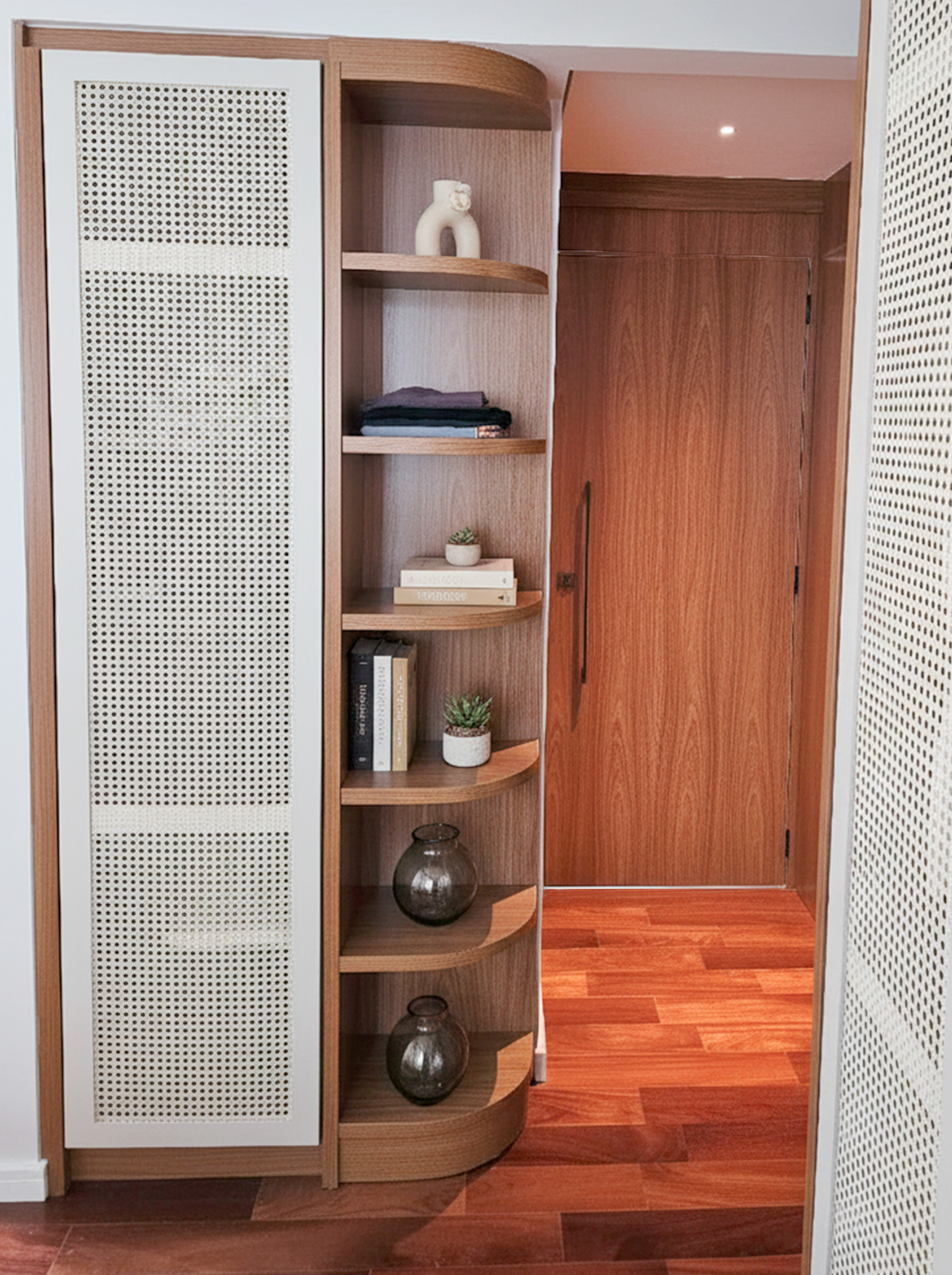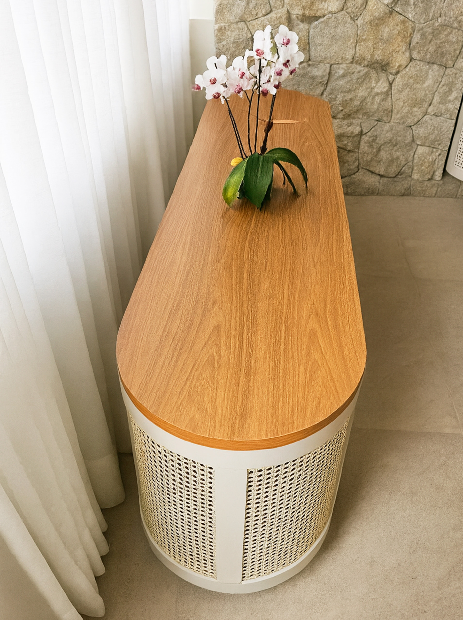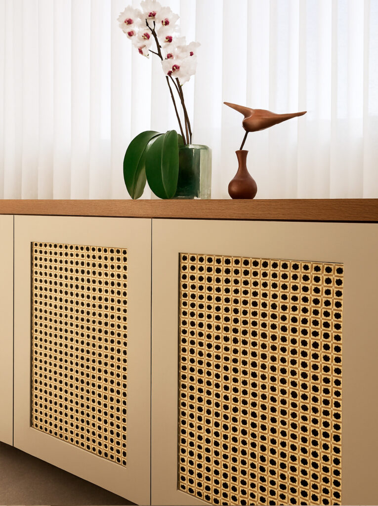 O projeto explora a combinação de MDF padrão amadeirado e superfícies laqueadas, criando uma base elegante e acolhedora, enriquecida pela presença de elementos tradicionais como a palhinha natural. Esse diálogo entre o contemporâneo e o clássico confere identidade aos ambientes, imprimindo leveza visual e uma sofisticação silenciosa. Cozinha, áreas sociais e suítes foram desenhadas com atenção rigorosa às proporções, aos detalhes de acabamento e à integração entre mobiliário e arquitetura.