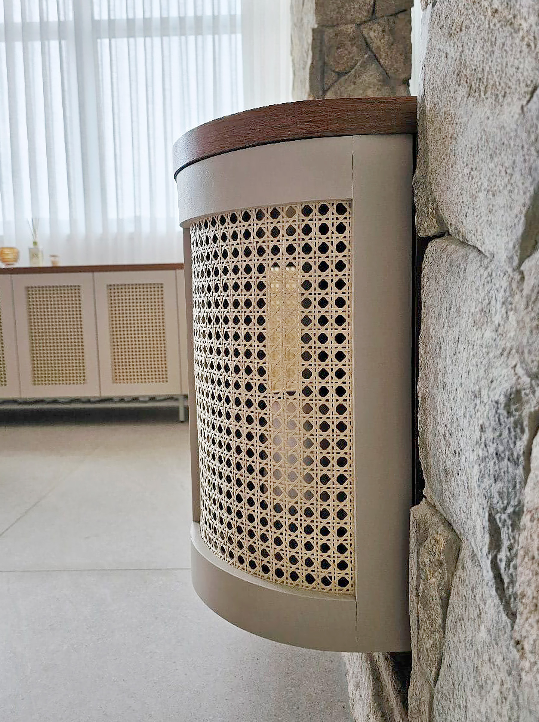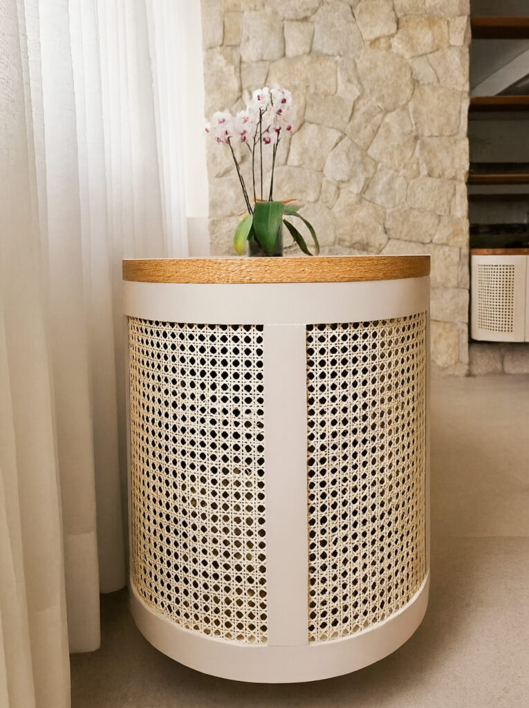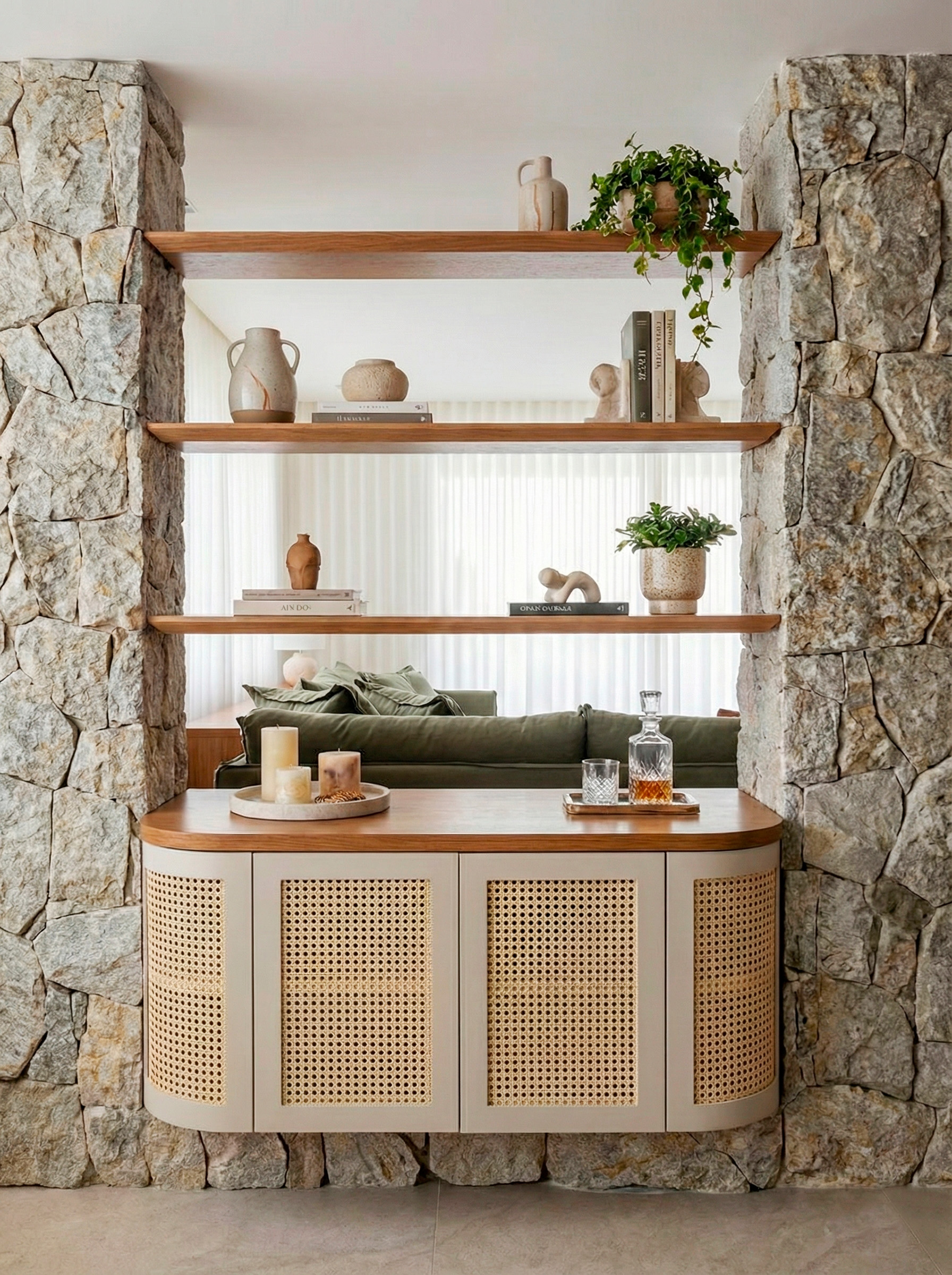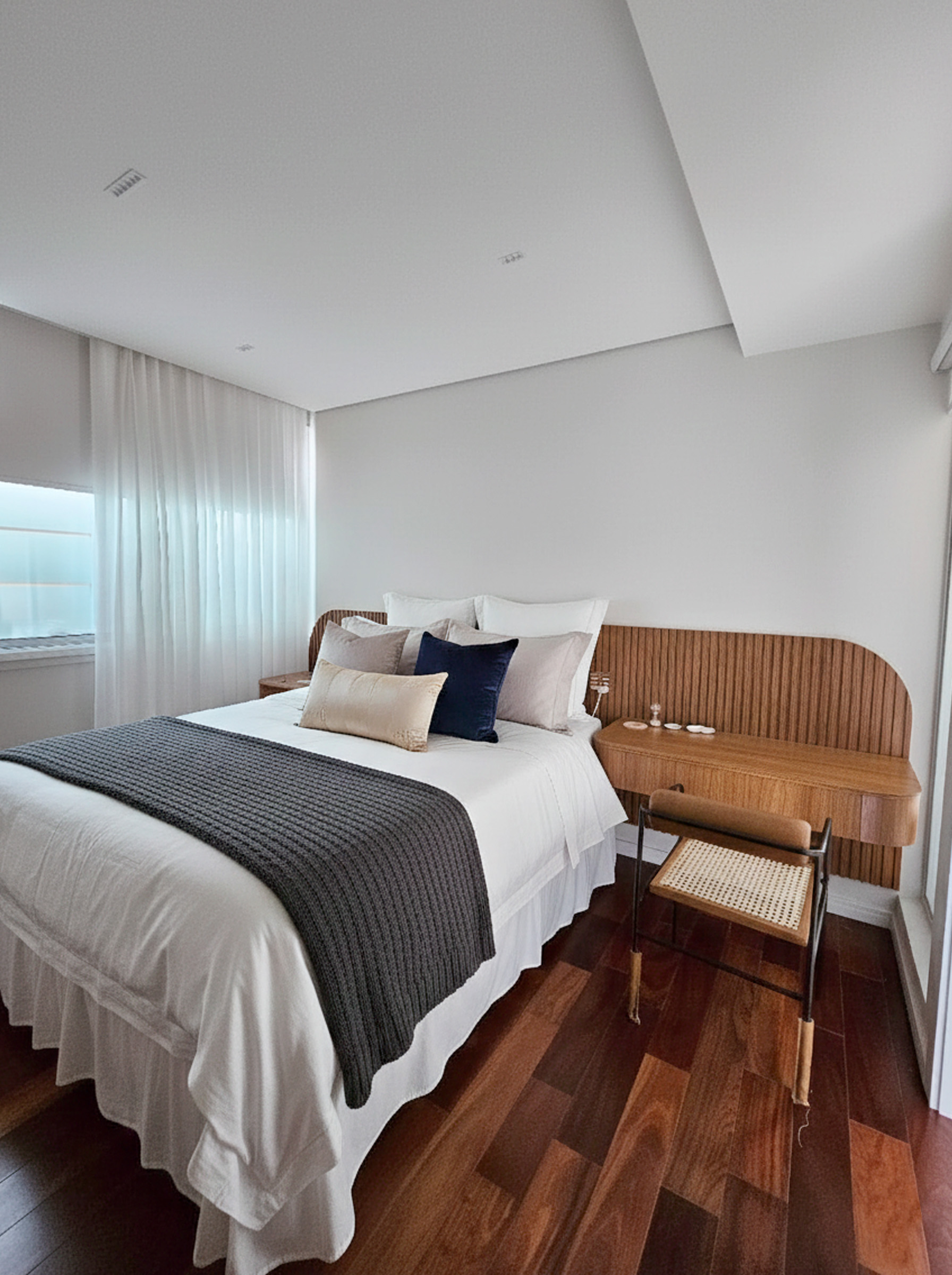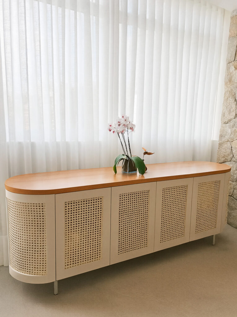 O projeto explora a combinação de MDF padrão amadeirado e superfícies laqueadas, criando uma base elegante e acolhedora, enriquecida pela presença de elementos tradicionais como a palhinha natural. Esse diálogo entre o contemporâneo e o clássico confere identidade aos ambientes, imprimindo leveza visual e uma sofisticação silenciosa. Cozinha, áreas sociais e suítes foram desenhadas com atenção rigorosa às proporções, aos detalhes de acabamento e à integração entre mobiliário e arquitetura.