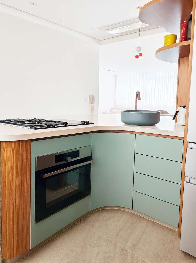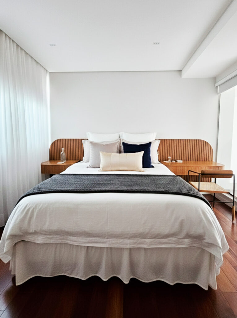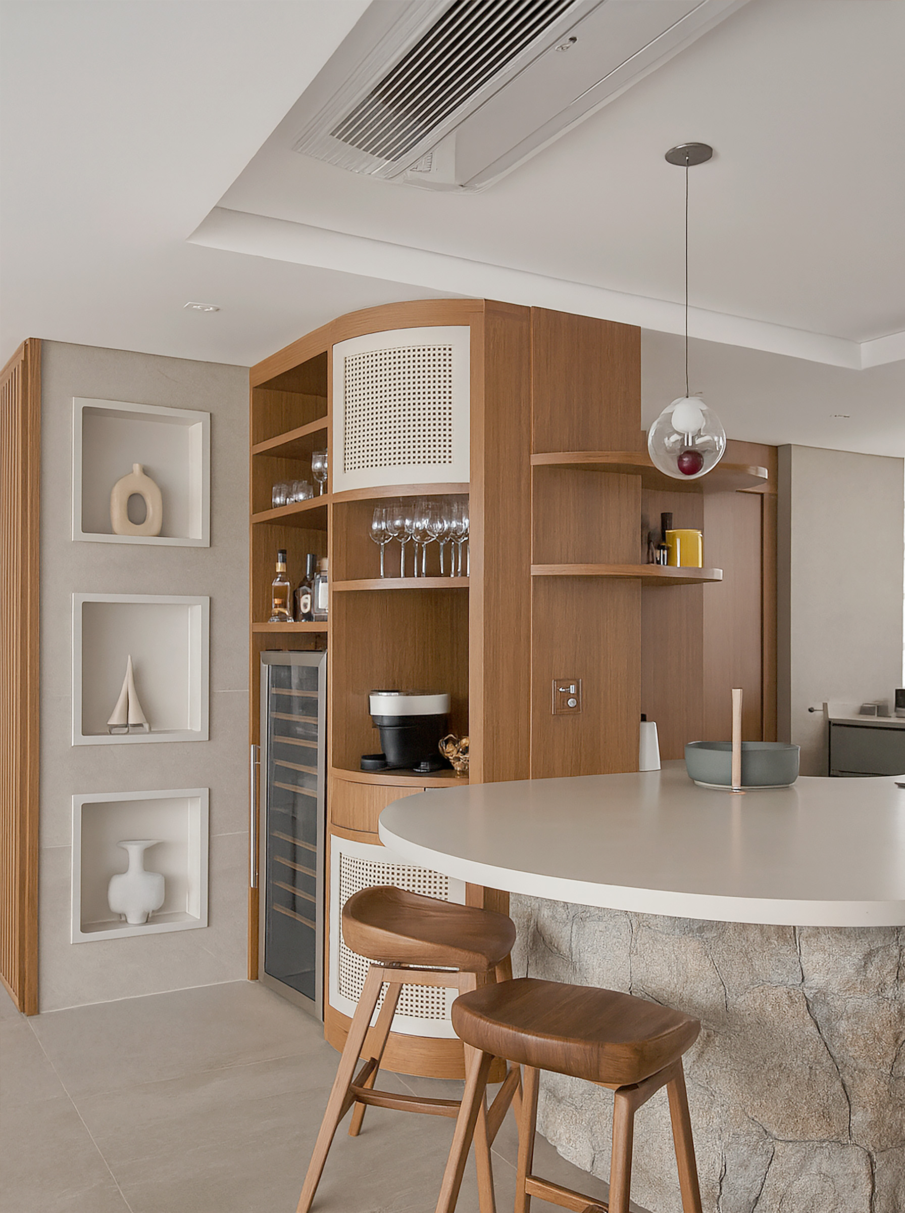 As curvas suaves, os volumes bem definidos e a iluminação cuidadosamente pensada reforçam a sensação de continuidade e harmonia entre os espaços. Cada peça de marcenaria assume papel arquitetônico, unindo funcionalidade, estética e excelência artesanal em um conjunto coeso e atemporal.