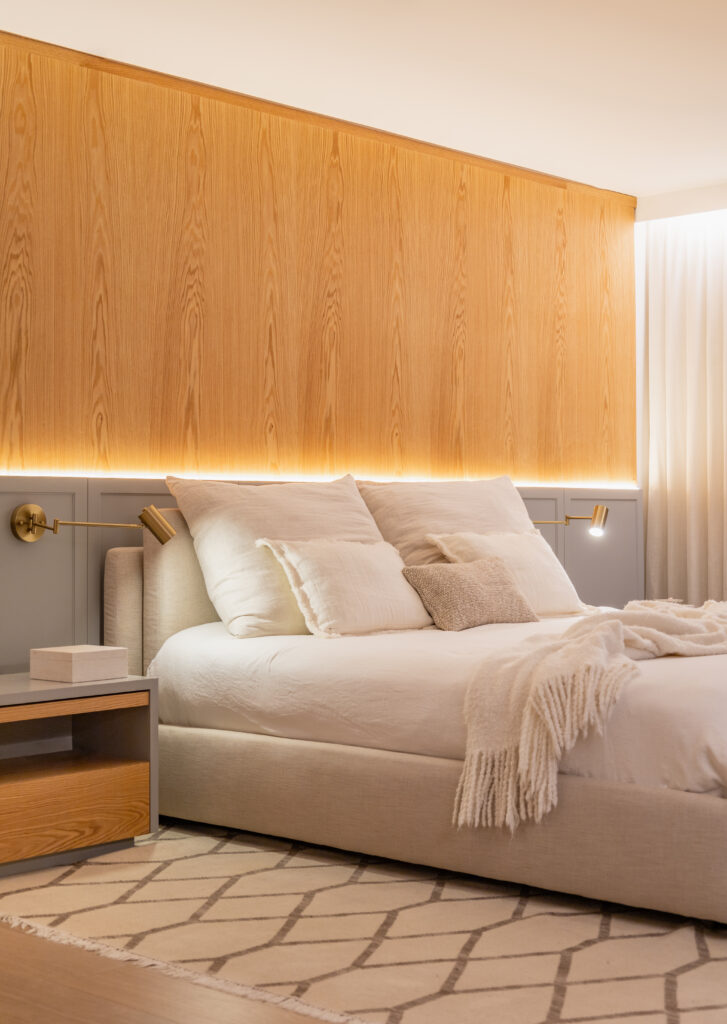 O aconchego desta suíte de casal é marcado pelo painel em lâminas naturais de Carvalho Americano, disposto de forma continua e simétrica, detalhe de zelo e qualidade na curadoria e escolha do material em busca da excelência, realçam a nobreza da madeira. A cabeceira ganha sofisticação com detalhes em boiserie, laqueados em tom verde que trazem um ambiente sereno, com acabamento acetinado de brilho 10%. A iluminação back light cria uma atmosfera intimista, enquanto as luminárias de leitura e mesas de apoio, no mesmo tom de laca com detalhes em Carvalho, reforçam a harmonia e a funcionalidade do espaço.